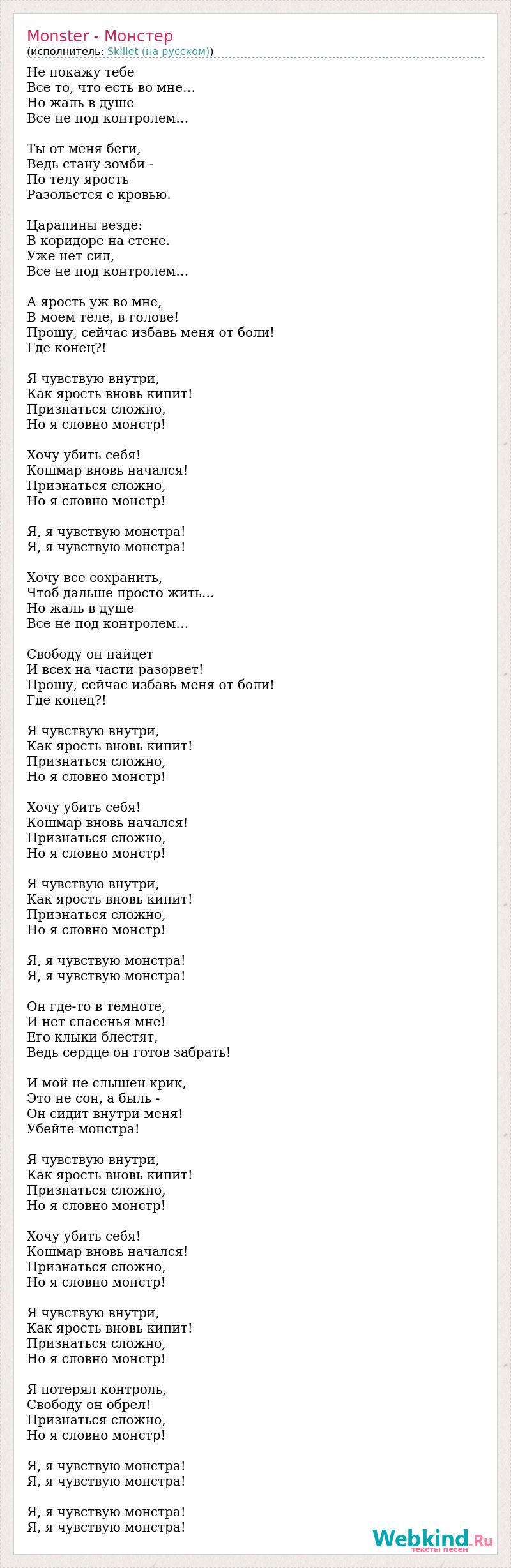 Не покажу тебе Все то, что есть во мне… Но жаль в душе Все не под контролем… Ты от меня беги, Ведь стану зомби - По телу ярость Разольется с кровью. Царапины везде: В коридоре на стене. Уже нет сил, Все не под контролем… А ярость уж во мне, В моем теле, в голове! Прошу, сейчас избавь меня от боли! Где конец?! Я чувствую внутри, Как ярость вновь кипит! Признаться сложно, Но я словно монстр! Хочу убить себя! Кошмар вновь начался! Признаться сложно, Но я словно монстр! Я, я чувствую монстра! Я, я чувствую монстра! Хочу все сохранить, Чтоб дальше просто жить… Но жаль в душе Все не под контролем… Свободу он найдет И всех на части разорвет! Прошу, сейчас избавь меня от боли! Где конец?! Я чувствую внутри, Как ярость вновь кипит! Признаться сложно, Но я словно монстр! Хочу убить себя! Кошмар вновь начался! Признаться сложно, Но я словно монстр! Я чувствую внутри, Как ярость вновь кипит! Признаться сложно, Но я словно монстр! Я, я чувствую монстра! Я, я чувствую монстра! Он где-то в темноте, И нет спасенья мне! Его клыки блестят, Ведь сердце он готов забрать! И мой не слышен крик, Это не сон, а быль - Он сидит внутри меня! Убейте монстра! Я чувствую внутри, Как ярость вновь кипит! Признаться сложно, Но я словно монстр! Хочу убить себя! Кошмар вновь начался! Признаться сложно, Но я словно монстр! Я чувствую внутри, Как ярость вновь кипит! Признаться сложно, Но я словно монстр! Я потерял контроль, Свободу он обрел! Признаться сложно, Но я словно монстр! Я, я чувствую монстра! Я, я чувствую монстра! Я, я чувствую монстра! Я, я чувствую монстра!