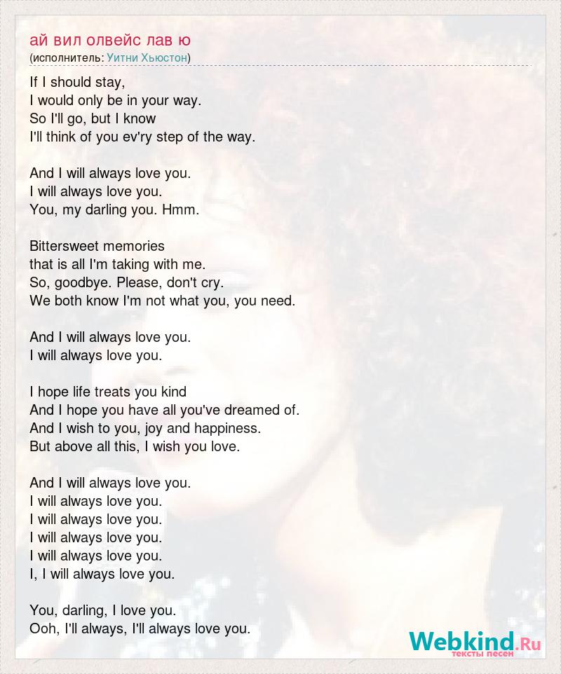 If I should stay, I would only be in your way. So I'll go, but I know I'll think of you ev'ry step of the way. And I will always love you. I will always love you. You, my darling you. Hmm. Bittersweet memories that is all I'm taking with me. So, goodbye. Please, don't cry. We both know I'm not what you, you need. And I will always love you. I will always love you. I hope life treats you kind And I hope you have all you've dreamed of. And I wish to you, joy and happiness. But above all this, I wish you love. And I will always love you. I will always love you. I will always love you. I will always love you. I will always love you. I, I will always love you. You, darling, I love you. Ooh, I'll always, I'll always love you.