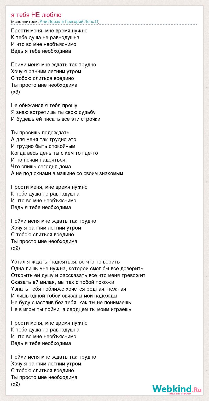 Прости меня, мне время нужно К тебе душа не равнодушна И что во мне необъяснимо Ведь я тебе необходима Пойми меня мне ждать так трудно Хочу я ранним летним утром С тобою слиться воедино Ты просто мне необходима (х3) Не обижайся я тебя прошу Я знаю встретишь ты свою судьбу И будешь ей писать все эти строчки Ты просишь подождать А для меня так трудно это И трудно быть спокойным Когда весь день ты с кем то где-то И по ночам надеяться, Что спишь сегодня дома А не под окнами в машине со своим знакомым Прости меня, мне время нужно К тебе душа не равнодушна И что во мне необъяснимо Ведь я тебе необходима Пойми меня мне ждать так трудно Хочу я ранним летним утром С тобою слиться воедино Ты просто мне необходима (х2) Устал я ждать, надеяться, во что то верить Одна лишь мне нужна, которой смог бы все доверить Открыть ей душу и рассказать все что меня тревожит Сказать ей милая, мы так с тобой похожи Узнать тебя поближе хочется родная, нежная И лишь одной тобой связаны мои надежды Не буду счастлив без тебя, как ты не понимаешь Не в игры ты пойми, а сердцем ты моим играешь Прости меня, мне время нужно К тебе душа не равнодушна И что во мне необъяснимо Ведь я тебе необходима Пойми меня мне ждать так трудно Хочу я ранним летним утром С тобою слиться воедино Ты просто мне необходима (х2)