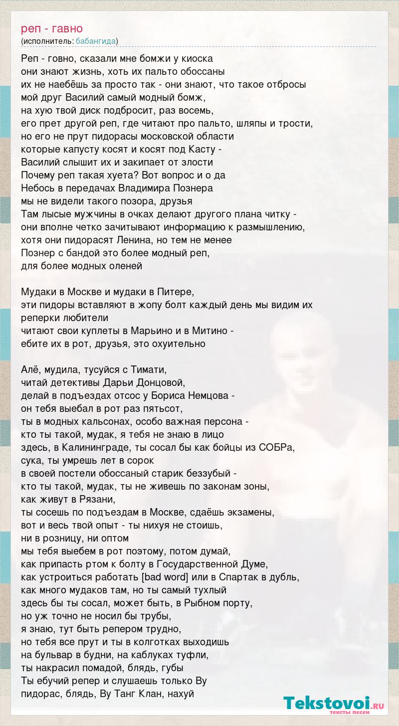 Реп - говно, сказали мне бомжи у киоска они знают жизнь, хоть их пальто обоссаны их не наебёшь за просто так - они знают, что такое отбросы мой друг Василий самый модный бомж, на хую твой диск подбросит, раз восемь, его прет другой реп, где читают про пальто, шляпы и трости, но его не прут пидорасы московской области которые капусту косят и косят под Касту - Василий слышит их и закипает от злости Почему реп такая хуета? Вот вопрос и о да Небось в передачах Владимира Познера мы не видели такого позора, друзья Там лысые мужчины в очках делают другого плана читку - они вполне четко зачитывают информацию к размышлению, хотя они пидорасят Ленина, но тем не менее Познер с бандой это более модный реп, для более модных оленей Мудаки в Москве и мудаки в Питере, эти пидоры вставляют в жопу болт каждый день мы видим их реперки любители читают свои куплеты в Марьино и в Митино - ебите их в рот, друзья, это охуительно Алё, мудила, тусуйся с Тимати, читай детективы Дарьи Донцовой, делай в подъездах отсос у Бориса Немцова - он тебя выебал в рот раз пятьсот, ты в модных кальсонах, особо важная персона - кто ты такой, мудак, я тебя не знаю в лицо здесь, в Калининграде, ты сосал бы как бойцы из СОБРа, сука, ты умрешь лет в сорок в своей постели обоссаный старик беззубый - кто ты такой, мудак, ты не живешь по законам зоны, как живут в Рязани, ты сосешь по подъездам в Москве, сдаёшь экзамены, вот и весь твой опыт - ты нихуя не стоишь, ни в розницу, ни оптом мы тебя выебем в рот поэтому, потом думай, как припасть ртом к болту в Государственной Думе, как устроиться работать [bad word] или в Спартак в дубль, как много мудаков там, но ты самый тухлый здесь бы ты сосал, может быть, в Рыбном порту, но уж точно не носил бы трубы, я знаю, тут быть репером трудно, но тебя все прут и ты в колготках выходишь на бульвар в будни, на каблуках туфли, ты накрасил помадой, блядь, губы Ты ебучий репер и слушаешь только Ву пидорас, блядь, Ву Танг Клан, нахуй