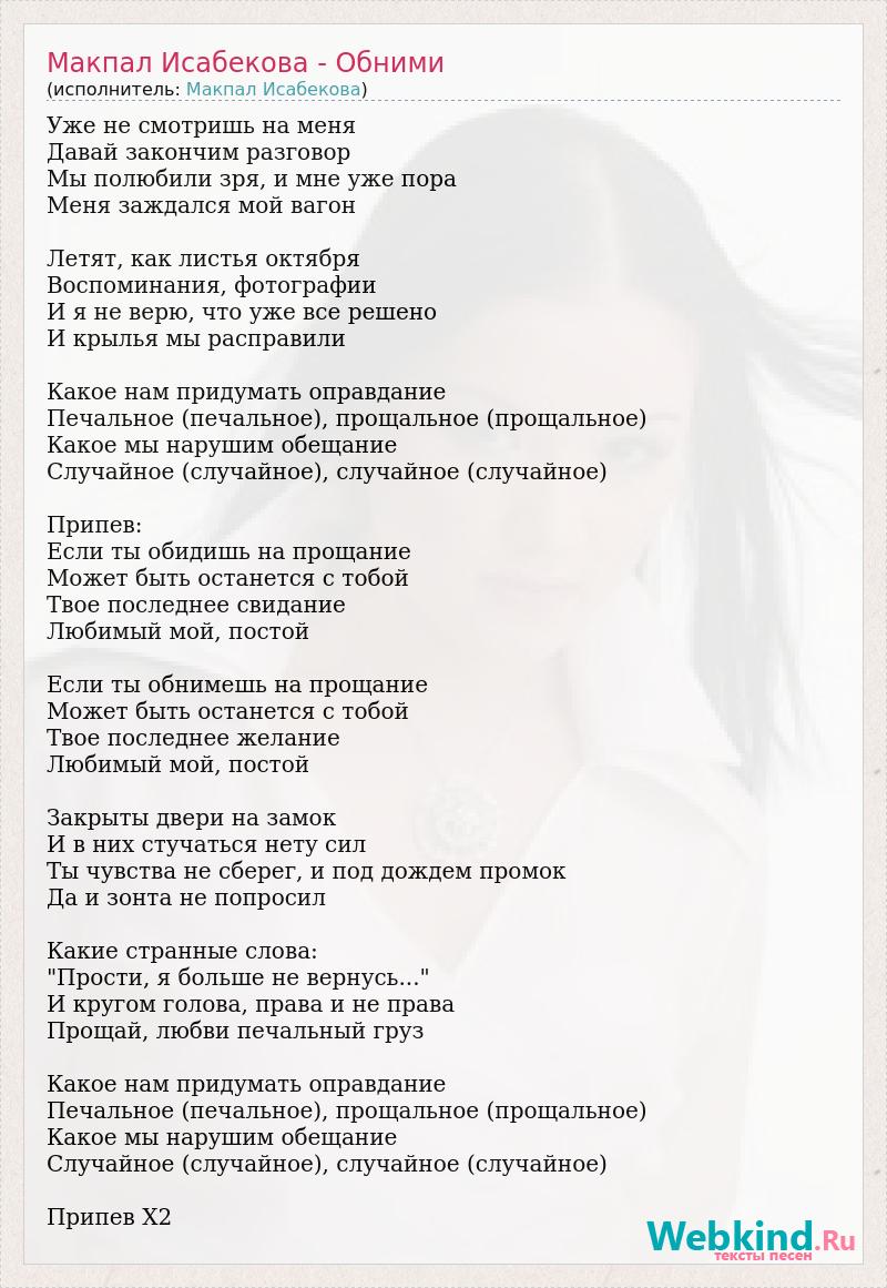 Уже не смотришь на меня Давай закончим разговор Мы полюбили зря, и мне уже пора Меня заждался мой вагон Летят, как листья октября Воспоминания, фотографии И я не верю, что уже все решено И крылья мы расправили Какое нам придумать оправдание Печальное (печальное), прощальное (прощальное) Какое мы нарушим обещание Случайное (случайное), случайное (случайное) Припев: Если ты обидишь на прощание Может быть останется с тобой Твое последнее свидание Любимый мой, постой Если ты обнимешь на прощание Может быть останется с тобой Твое последнее желание Любимый мой, постой Закрыты двери на замок И в них стучаться нету сил Ты чувства не сберег, и под дождем промок Да и зонта не попросил Какие странные слова: "Прости, я больше не вернусь..." И кругом голова, права и не права Прощай, любви печальный груз Какое нам придумать оправдание Печальное (печальное), прощальное (прощальное) Какое мы нарушим обещание Случайное (случайное), случайное (случайное) Припев Х2