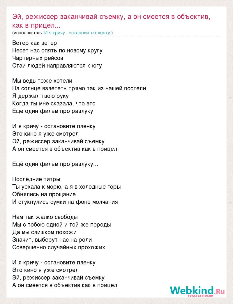 Ветер как ветер Несет нас опять по новому кругу Чартерных рейсов Стаи людей направляются к югу Мы ведь тоже хотели На солнце взлететь прямо так из нашей постели Я держал твою руку Когда ты мне сказала, что это Еще один фильм про разлуку И я кричу - остановите пленку Это кино я уже смотрел Эй, режиссер заканчивай съемку А он смеется в объектив как в прицел Ещё один фильм про разлуку... Последние титры Ты уехала к морю, а я в холодные горы Обнялись на прощание И стукнулись сумки на фоне молчания Нам так жалко свободы Мы с тобою одной и той же породы Да мы слишком похожи Значит, выберут нас на роли Совершенно случайных прохожих И я кричу - остановите пленку Это кино я уже смотрел Эй, режиссер заканчивай съемку А он смеется в объектив как в прицел