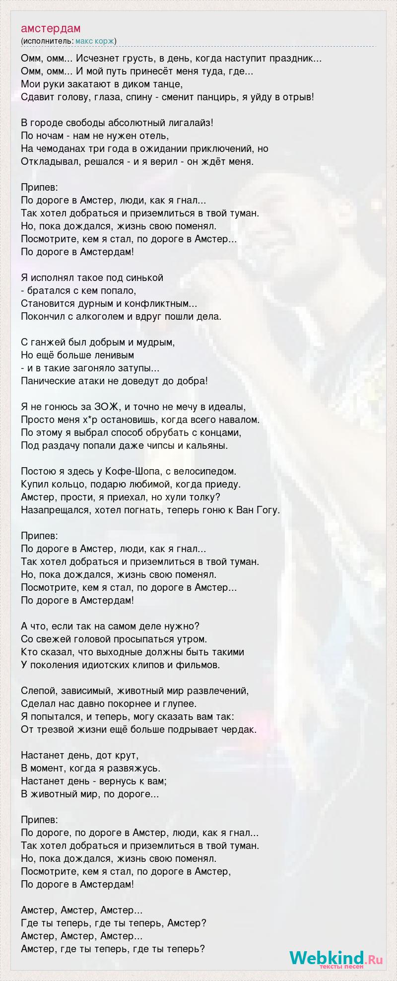 Омм, омм... Исчезнет грусть, в день, когда наступит праздник... Омм, омм... И мой путь принесёт меня туда, где... Мои руки закатают в диком танце, Сдавит голову, глаза, спину - сменит панцирь, я уйду в отрыв! В городе свободы абсолютный лигалайз! По ночам - нам не нужен отель, На чемоданах три года в ожидании приключений, но Откладывал, решался - и я верил - он ждёт меня. Припев: По дороге в Амстер, люди, как я гнал... Так хотел добраться и приземлиться в твой туман. Но, пока дождался, жизнь свою поменял. Посмотрите, кем я стал, по дороге в Амстер... По дороге в Амстердам! Я исполнял такое под синькой - братался с кем попало, Становится дурным и конфликтным... Покончил с алкоголем и вдруг пошли дела. С ганжей был добрым и мудрым, Но ещё больше ленивым - и в такие загоняло затупы... Панические атаки не доведут до добра! Я не гонюсь за ЗОЖ, и точно не мечу в идеалы, Просто меня х*р остановишь, когда всего навалом. По этому я выбрал способ обрубать с концами, Под раздачу попали даже чипсы и кальяны. Постою я здесь у Кофе-Шопа, с велосипедом. Купил кольцо, подарю любимой, когда приеду. Амстер, прости, я приехал, но хули толку? Назапрещался, хотел погнать, теперь гоню к Ван Гогу. Припев: По дороге в Амстер, люди, как я гнал... Так хотел добраться и приземлиться в твой туман. Но, пока дождался, жизнь свою поменял. Посмотрите, кем я стал, по дороге в Амстер... По дороге в Амстердам! А что, если так на самом деле нужно? Со свежей головой просыпаться утром. Кто сказал, что выходные должны быть такими У поколения идиотских клипов и фильмов. Слепой, зависимый, животный мир развлечений, Сделал нас давно покорнее и глупее. Я попытался, и теперь, могу сказать вам так: От трезвой жизни ещё больше подрывает чердак. Настанет день, дот крут, В момент, когда я развяжусь. Настанет день - вернусь к вам; В животный мир, по дороге... Припев: По дороге, по дороге в Амстер, люди, как я гнал... Так хотел добраться и приземлиться в твой туман. Но, пока дождался, жизнь свою поменял. Посмотрите, кем я стал, по дороге в Амстер, По дороге в Амстердам! Амстер, Амстер, Амстер... Где ты теперь, где ты теперь, Амстер? Амстер, Амстер, Амстер... Амстер, где ты теперь, где ты теперь?
