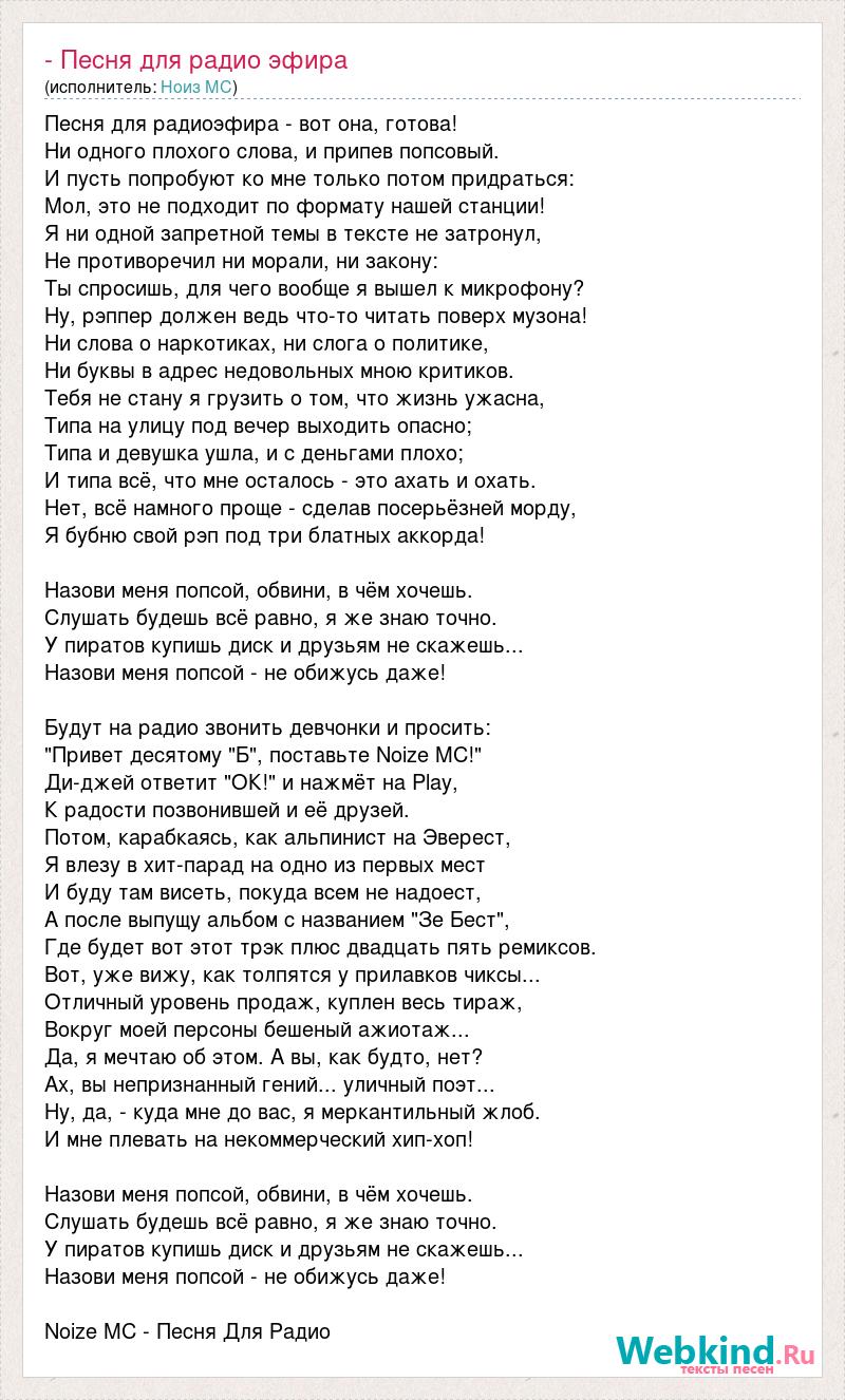 Песня для радиоэфира - вот она, готова! Ни одного плохого слова, и припев попсовый. И пусть попробуют ко мне только потом придраться: Мол, это не подходит по формату нашей станции! Я ни одной запретной темы в тексте не затронул, Не противоречил ни морали, ни закону: Ты спросишь, для чего вообще я вышел к микрофону? Ну, рэппер должен ведь что-то читать поверх музона! Ни слова о наркотиках, ни слога о политике, Ни буквы в адрес недовольных мною критиков. Тебя не стану я грузить о том, что жизнь ужасна, Типа на улицу под вечер выходить опасно; Типа и девушка ушла, и с деньгами плохо; И типа всё, что мне осталось - это ахать и охать. Нет, всё намного проще - сделав посерьёзней морду, Я бубню свой рэп под три блатных аккорда! Назови меня попсой, обвини, в чём хочешь. Слушать будешь всё равно, я же знаю точно. У пиратов купишь диск и друзьям не скажешь... Назови меня попсой - не обижусь даже! Будут на радио звонить девчонки и просить: "Привет десятому "Б", поставьте Noize MC!" Ди-джей ответит "ОК!" и нажмёт на Play, К радости позвонившей и её друзей. Потом, карабкаясь, как альпинист на Эверест, Я влезу в хит-парад на одно из первых мест И буду там висеть, покуда всем не надоест, А после выпущу альбом с названием "Зе Бест", Где будет вот этот трэк плюс двадцать пять ремиксов. Вот, уже вижу, как толпятся у прилавков чиксы... Отличный уровень продаж, куплен весь тираж, Вокруг моей персоны бешеный ажиотаж... Да, я мечтаю об этом. А вы, как будто, нет? Ах, вы непризнанный гений... уличный поэт... Ну, да, - куда мне до вас, я меркантильный жлоб. И мне плевать на некоммерческий хип-хоп! Назови меня попсой, обвини, в чём хочешь. Слушать будешь всё равно, я же знаю точно. У пиратов купишь диск и друзьям не скажешь... Назови меня попсой - не обижусь даже! Noize MC - Песня Для Радио