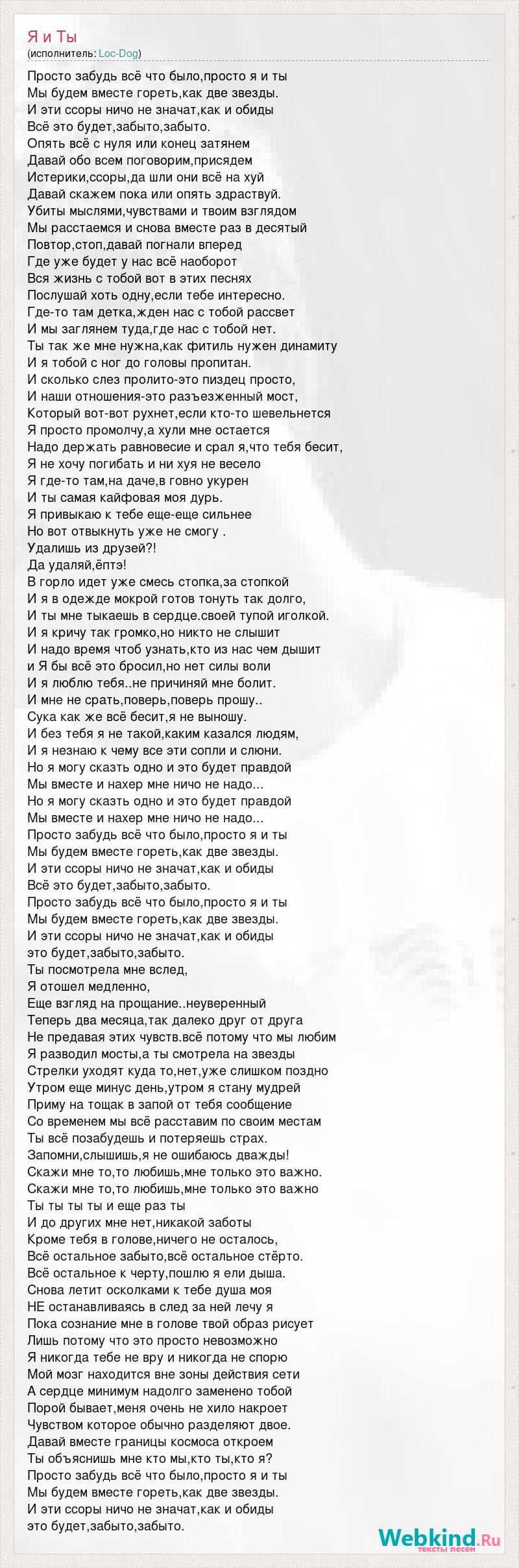 Просто забудь всё что было,просто я и ты Мы будем вместе гореть,как две звезды. И эти ссоры ничо не значат,как и обиды Всё это будет,забыто,забыто. Опять всё с нуля или конец затянем Давай обо всем поговорим,присядем Истерики,ссоры,да шли они всё на хуй Давай скажем пока или опять здраствуй. Убиты мыслями,чувствами и твоим взглядом Мы расстаемся и снова вместе раз в десятый Повтор,стоп,давай погнали вперед Где уже будет у нас всё наоборот Вся жизнь с тобой вот в этих песнях Послушай хоть одну,если тебе интересно. Где-то там детка,жден нас с тобой рассвет И мы заглянем туда,где нас с тобой нет. Ты так же мне нужна,как фитиль нужен динамиту И я тобой с ног до головы пропитан. И сколько слез пролито-это пиздец просто, И наши отношения-это разъезженный мост, Который вот-вот рухнет,если кто-то шевельнется Я просто промолчу,а хули мне остается Надо держать равновесие и срал я,что тебя бесит, Я не хочу погибать и ни хуя не весело Я где-то там,на даче,в говно укурен И ты самая кайфовая моя дурь. Я привыкаю к тебе еще-еще сильнее Но вот отвыкнуть уже не смогу . Удалишь из друзей?! Да удаляй,ёптэ! В горло идет уже смесь стопка,за стопкой И я в одежде мокрой готов тонуть так долго, И ты мне тыкаешь в сердце.своей тупой иголкой. И я кричу так громко,но никто не слышит И надо время чтоб узнать,кто из нас чем дышит и Я бы всё это бросил,но нет силы воли И я люблю тебя..не причиняй мне болит. И мне не срать,поверь,поверь прошу.. Сука как же всё бесит,я не выношу. И без тебя я не такой,каким казался людям, И я незнаю к чему все эти сопли и слюни. Но я могу сказть одно и это будет правдой Мы вместе и нахер мне ничо не надо... Но я могу сказть одно и это будет правдой Мы вместе и нахер мне ничо не надо... Просто забудь всё что было,просто я и ты Мы будем вместе гореть,как две звезды. И эти ссоры ничо не значат,как и обиды Всё это будет,забыто,забыто. Просто забудь всё что было,просто я и ты Мы будем вместе гореть,как две звезды. И эти ссоры ничо не значат,как и обиды это будет,забыто,забыто. Ты посмотрела мне вслед, Я отошел медленно, Еще взгляд на прощание..неуверенный Теперь два месяца,так далеко друг от друга Не предавая этих чувств.всё потому что мы любим Я разводил мосты,а ты смотрела на звезды Стрелки уходят куда то,нет,уже слишком поздно Утром еще минус день,утром я стану мудрей Приму на тощак в запой от тебя сообщение Со временем мы всё расставим по своим местам Ты всё позабудешь и потеряешь страх. Запомни,слышишь,я не ошибаюсь дважды! Скажи мне то,то любишь,мне только это важно. Скажи мне то,то любишь,мне только это важно Ты ты ты ты и еще раз ты И до других мне нет,никакой заботы Кроме тебя в голове,ничего не осталось, Всё остальное забыто,всё остальное стёрто. Всё остальное к черту,пошлю я ели дыша. Снова летит осколками к тебе душа моя НЕ останавливаясь в след за ней лечу я Пока сознание мне в голове твой образ рисует Лишь потому что это просто невозможно Я никогда тебе не вру и никогда не спорю Мой мозг находится вне зоны действия сети А сердце минимум надолго заменено тобой Порой бывает,меня очень не хило накроет Чувством которое обычно разделяют двое. Давай вместе границы космоса откроем Ты объяснишь мне кто мы,кто ты,кто я? Просто забудь всё что было,просто я и ты Мы будем вместе гореть,как две звезды. И эти ссоры ничо не значат,как и обиды это будет,забыто,забыто.