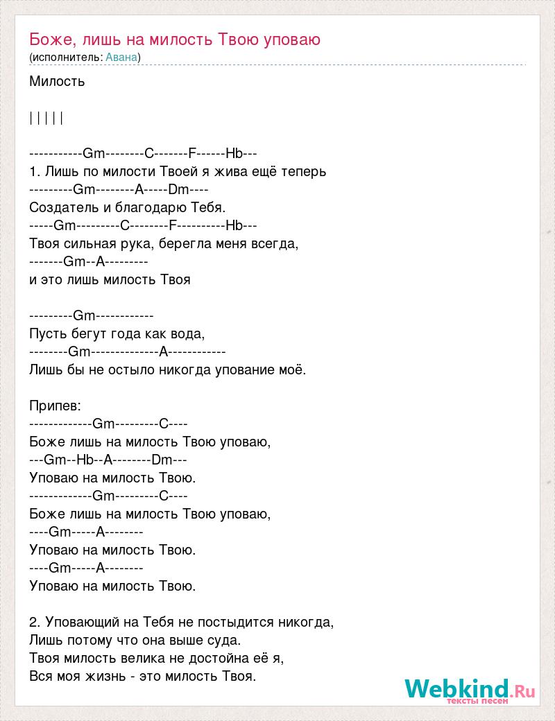 Милость | | | | | -----------Gm--------C-------F------Hb--- 1. Лишь по милости Твоей я жива ещё теперь ---------Gm--------A-----Dm---- Создатель и благодарю Тебя. -----Gm---------C--------F----------Hb--- Твоя сильная рука, берегла меня всегда, -------Gm--A--------- и это лишь милость Твоя ---------Gm------------ Пусть бегут года как вода, --------Gm--------------A------------ Лишь бы не остыло никогда упование моё. Припев: -------------Gm---------C---- Боже лишь на милость Твою уповаю, ---Gm--Hb--A--------Dm--- Уповаю на милость Твою. -------------Gm---------C---- Боже лишь на милость Твою уповаю, ----Gm-----A-------- Уповаю на милость Твою. ----Gm-----A-------- Уповаю на милость Твою. 2. Уповающий на Тебя не постыдится никогда, Лишь потому что она выше суда. Твоя милость велика не достойна её я, Вся моя жизнь - это милость Твоя.
