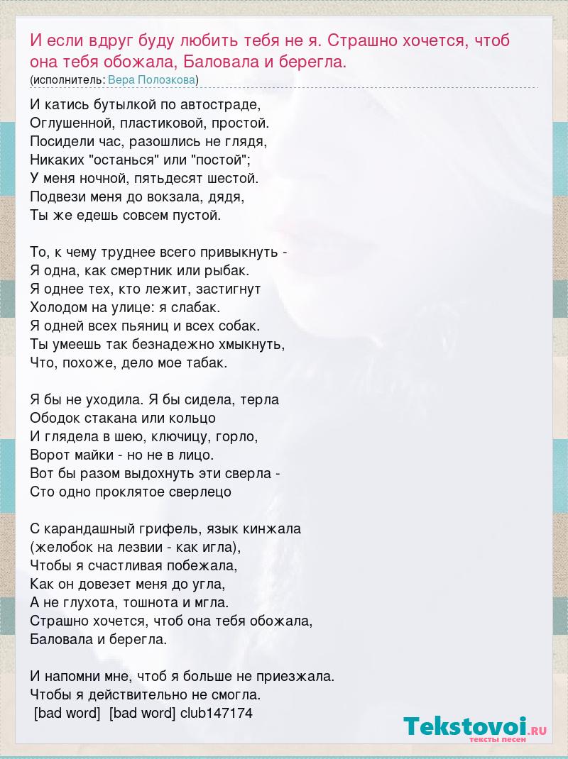 Главная→Исполнители→Вера Полозкова→И если вдруг буду любить тебя не я. Страшно хочется, чтоб она тебя обожала, Б