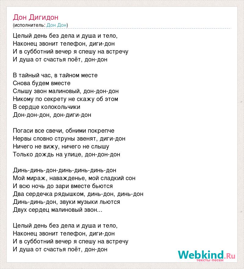 Целый день без дела и душа и тело, Наконец звонит телефон, диги-дон И в субботний вечер я спешу на встречу И душа от счастья поёт, дон-дон В тайный час, в тайном месте Снова будем вместе Слышу звон малиновый, дон-дон-дон Никому по секрету не скажу об этом В сердце колокольчики Дон-дон-дон, дон-диги-дон Погаси все свечи, обними покрепче Нервы словно струны звенят, диги-дон Ничего не вижу, ничего не слышу Только дождь на улице, дон-дон-дон Динь-динь-дон-динь-динь-динь-дон Мой мираж, наважденье, мой сладкий сон И всю ночь до зари вместе бьются Два сердечка рядышком, динь-дон, динь-дон Динь-динь-дон, звуки музыки льются Двух сердец малиновый звон... Целый день без дела и душа и тело, Наконец звонит телефон, диги-дон И в субботний вечер я спешу на встречу И душа от счастья поёт, дон-дон