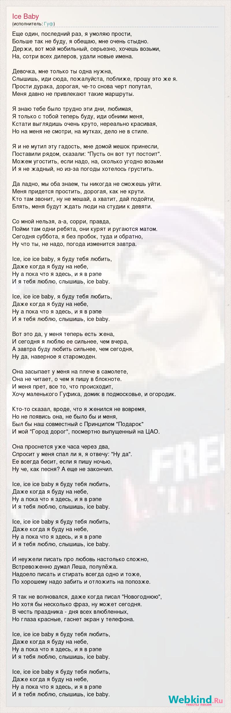 Еще один, последний раз, я умоляю прости, Больше так не буду, я обещаю, мне очень стыдно. Держи, вот мой мобильный, серьезно, хочешь возьми, На, сотри всех дилеров, удали новые имена. Девочка, мне только ты одна нужна, Слышишь, иди сюда, пожалуйста, поближе, прошу это же я. Прости дурака, дорогая, че-то снова черт попутал, Меня давно не привлекают такие маршруты. Я знаю тебе было трудно эти дни, любимая, Я только с тобой теперь буду, иди обними меня, Кстати выглядишь очень круто, нереально красивая, Но на меня не смотри, на мутках, дело не в стиле. Я и не мутил эту гадость, мне домой мешок принесли, Поставили рядом, сказали: "Пусть он вот тут постоит". Можем угостить, если надо, на, сколько угодно возьми И я не жадный, но из-за погоды хотелось грустить. Да ладно, мы оба знаем, ты никогда не сможешь уйти. Меня придется простить, дорогая, как не крути. Кто там звонит, ну не мешай, а хватит, дай подойти, Блять, меня будут ждать люди на студии к девяти. Со мной нельзя, а-а, сорри, правда, Пойми там одни ребята, они курят и ругаются матом. Сегодня суббота, я без пробок, туда и обратно, Ну что ты, не надо, погода изменится завтра. Ice, ice ice baby, я буду тебя любить, Даже когда я буду на небе, Ну а пока что я здесь, и я в рэпе И я тебя люблю, слышишь, ice baby. Ice, ice ice baby, я буду тебя любить, Даже когда я буду на небе, Ну а пока что я здесь, и я в рэпе И я тебя люблю, слышишь, ice baby. Вот это да, у меня теперь есть жена, И сегодня я люблю ее сильнее, чем вчера, А завтра буду любить сильнее, чем сегодня, Ну да, наверное я старомоден. Она засыпает у меня на плече в самолете, Она не читает, о чем я пишу в блокноте. И меня прет, все то, что происходит, Хочу маленького Гуфика, домик в подмосковье, и огородик. Кто-то сказал, вроде, что я женился не вовремя, Но не появись она, не было бы и меня, Был бы наш совместный с Принципом "Подарок" И мой "Город дорог", посмертно выпущенный на ЦАО. Она проснется уже часа через два, Спросит у меня спал ли я, я отвечу: "Ну да". Ее всегда бесит, если я пишу ночью, Ну че, как песня? А еще не закончил. Ice, ice ice baby я буду тебя любить, Даже когда я буду на небе, Ну а пока что я здесь, и я в рэпе И я тебя люблю, слышишь, ice baby. Ice, ice ice baby я буду тебя любить, Даже когда я буду на небе, Ну а пока что я здесь, и я в рэпе И я тебя люблю, слышишь, ice baby. И неужели писать про любовь настолько сложно, Встревоженно думал Леша, полулёжа. Надоело писать и стирать всегда одно и тоже, По хорошему надо забить и отложить на попозже. Я так не волновался, даже когда писал "Новогоднюю", Но хотя бы несколько фраз, ну может сегодня. В честь праздника - дня всех влюбленных, Но глаза красные, гаснет экран у телефона. Ice, ice ice baby я буду тебя любить, Даже когда я буду на небе, Ну а пока что я здесь, и я в рэпе И я тебя люблю, слышишь, ice baby. Ice, ice ice baby я буду тебя любить, Даже когда я буду на небе, Ну а пока что я здесь, и я в рэпе И я тебя люблю, слышишь, ice baby.
