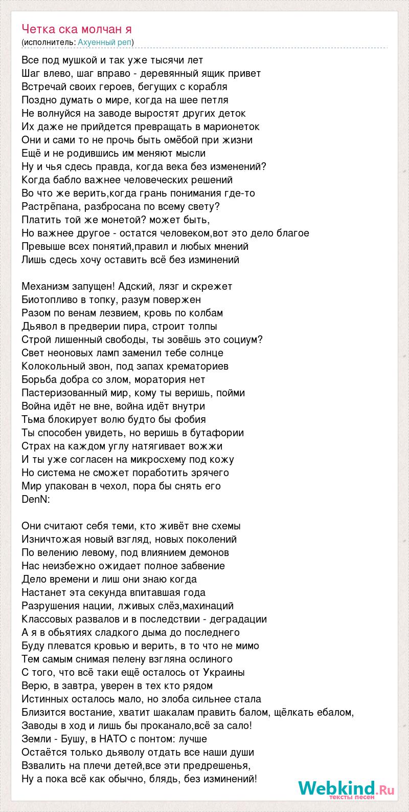 Все под мушкой и так уже тысячи лет Шаг влево, шаг вправо - деревянный ящик привет Встречай своих героев, бегущих с корабля Поздно думать о мире, когда на шее петля Не волнуйся на заводе выростят других деток Их даже не прийдется превращать в марионеток Они и сами то не прочь быть омёбой при жизни Ещё и не родившись им меняют мысли Ну и чья сдесь правда, когда века без изменений? Когда бабло важнее человеческих решений Во что же верить,когда грань понимания где-то Растрёпана, разбросана по всему свету? Платить той же монетой? может быть, Но важнее другое - остатся человеком,вот это дело благое Превыше всех понятий,правил и любых мнений Лишь сдесь хочу оставить всё без изминений Механизм запущен! Адский, лязг и скрежет Биотопливо в топку, разум повержен Разом по венам лезвием, кровь по колбам Дьявол в предверии пира, строит толпы Строй лишенный свободы, ты зовёшь это социум? Свет неоновых ламп заменил тебе солнце Колокольный звон, под запах крематориев Борьба добра со злом, моратория нет Пастеризованный мир, кому ты веришь, пойми Война идёт не вне, война идёт внутри Тьма блокирует волю будто бы фобия Ты способен увидеть, но веришь в бутафории Страх на каждом углу натягивает вожжи И ты уже согласен на микросхему под кожу Но система не сможет поработить зрячего Мир упакован в чехол, пора бы снять его DenN: Они считают себя теми, кто живёт вне схемы Изничтожая новый взгляд, новых поколений По велению левому, под влиянием демонов Нас неизбежно ожидает полное забвение Дело времени и лиш они знаю когда Настанет эта секунда впитавшая года Разрушения нации, лживых слёз,махинаций Классовых развалов и в последствии - деградации А я в обьятиях сладкого дыма до последнего Буду плеватся кровью и верить, в то что не мимо Тем самым снимая пелену взгляна ослиного С того, что всё таки ещё осталось от Украины Верю, в завтра, уверен в тех кто рядом Истинных осталось мало, но злоба сильнее стала Близится востание, хватит шакалам править балом, щёлкать ебалом, Заводы в ход и лишь бы проканало,всё за сало! Земли - Бушу, в НАТО с понтом: лучше Остаётся только дьяволу отдать все наши души Взвалить на плечи детей,все эти предрешенья, Ну а пока всё как обычно, блядь, без изминений!