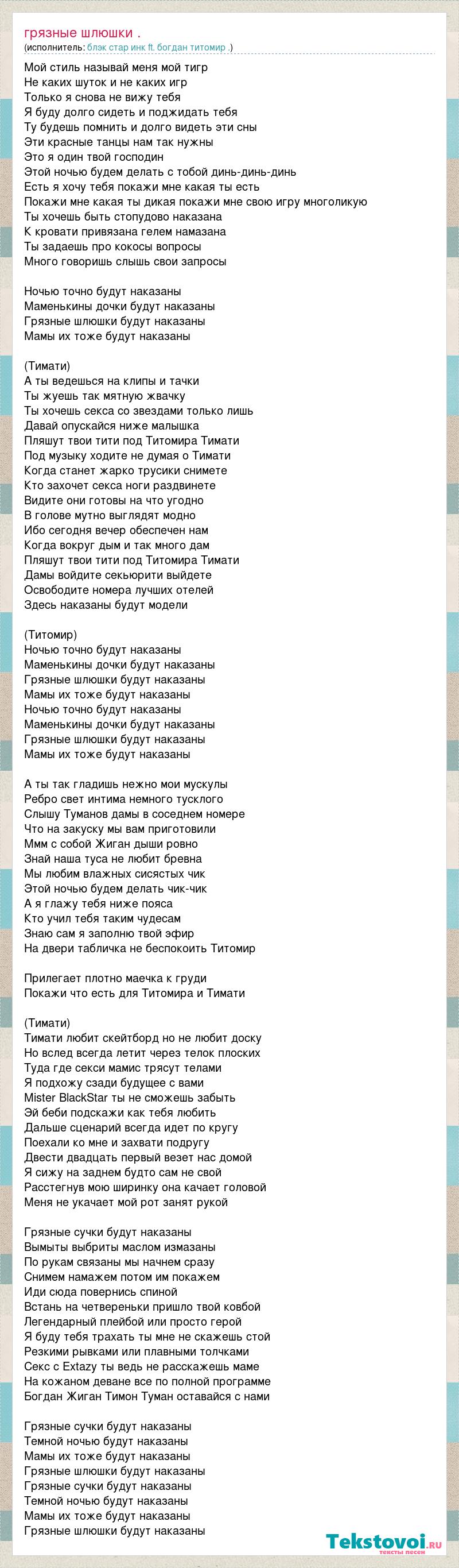 Мой стиль называй меня мой тигр Не каких шуток и не каких игр Только я снова не вижу тебя Я буду долго сидеть и поджидать тебя Ту будешь помнить и долго видеть эти сны Эти красные танцы нам так нужны Это я один твой господин Этой ночью будем делать с тобой динь-динь-динь Есть я хочу тебя покажи мне какая ты есть Покажи мне какая ты дикая покажи мне свою игру многоликую Ты хочешь быть стопудово наказана К кровати привязана гелем намазана Ты задаешь про кокосы вопросы Много говоришь слышь свои запросы Ночью точно будут наказаны Маменькины дочки будут наказаны Грязные шлюшки будут наказаны Мамы их тоже будут наказаны (Тимати) А ты ведешься на клипы и тачки Ты жуешь так мятную жвачку Ты хочешь секса со звездами только лишь Давай опускайся ниже малышка Пляшут твои тити под Титомира Тимати Под музыку ходите не думая о Тимати Когда станет жарко трусики снимете Кто захочет секса ноги раздвинете Видите они готовы на что угодно В голове мутно выглядят модно Ибо сегодня вечер обеспечен нам Когда вокруг дым и так много дам Пляшут твои тити под Титомира Тимати Дамы войдите секьюрити выйдете Освободите номера лучших отелей Здесь наказаны будут модели (Титомир) Ночью точно будут наказаны Маменькины дочки будут наказаны Грязные шлюшки будут наказаны Мамы их тоже будут наказаны Ночью точно будут наказаны Маменькины дочки будут наказаны Грязные шлюшки будут наказаны Мамы их тоже будут наказаны А ты так гладишь нежно мои мускулы Ребро свет интима немного тусклого Слышу Туманов дамы в соседнем номере Что на закуску мы вам приготовили Ммм с собой Жиган дыши ровно Знай наша туса не любит бревна Мы любим влажных сисястых чик Этой ночью будем делать чик-чик А я глажу тебя ниже пояса Кто учил тебя таким чудесам Знаю сам я заполню твой эфир На двери табличка не беспокоить Титомир Прилегает плотно маечка к груди Покажи что есть для Титомира и Тимати (Тимати) Тимати любит скейтборд но не любит доску Но вслед всегда летит через телок плоских Туда где секси мамис трясут телами Я подхожу сзади будущее с вами Mister BlackStar ты не сможешь забыть Эй беби подскажи как тебя любить Дальше сценарий всегда идет по кругу Поехали ко мне и захвати подругу Двести двадцать первый везет нас домой Я сижу на заднем будто сам не свой Расстегнув мою ширинку она качает головой Меня не укачает мой рот занят рукой Грязные сучки будут наказаны Вымыты выбриты маслом измазаны По рукам связаны мы начнем сразу Снимем намажем потом им покажем Иди сюда повернись спиной Встань на четвереньки пришло твой ковбой Легендарный плейбой или просто герой Я буду тебя трахать ты мне не скажешь стой Резкими рывками или плавными толчками Секс с Extazy ты ведь не расскажешь маме На кожаном деване все по полной программе Богдан Жиган Тимон Туман оставайся с нами Грязные сучки будут наказаны Темной ночью будут наказаны Мамы их тоже будут наказаны Грязные шлюшки будут наказаны Грязные сучки будут наказаны Темной ночью будут наказаны Мамы их тоже будут наказаны Грязные шлюшки будут наказаны