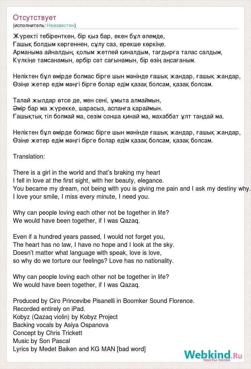 Жүректі тебіренткен, бір қыз бар, екен бұл әлемде, Ғашық болдым көргеннен, сұлу саз, ерекше көркіңе. Арманыма айналдың, қолым жетпей қиналдым, тағдырға талас салдым, Күлкіңе тамсанамын, әрбір сәт сағынамын, бір өзің аңсағаным. Неліктен бұл өмірде болмас бірге шын мәнінде ғашық жандар, ғашық жандар, Өзіңе жетер едім мәңгі бірге болар едім қазақ болсам, қазақ болсам. Талай жылдар өтсе де, мен сені, ұмыта алмаймын, Әмір бар ма жүрекке, шарасыз, аспанға қараймын. Ғашықтық тіл болмай ма, сезім сонша қинай ма, махаббат ұлт таңдай ма. Неліктен бұл өмірде болмас бірге шын мәнінде ғашық жандар, ғашық жандар, Өзіңе жетер едім мәңгі бірге болар едім қазақ болсам, қазақ болсам. Translation: There is a girl in the world and that’s braking my heart I fell in love at the first sight, with her beauty, elegance. You became my dream, not being with you is giving me pain and I ask my destiny why. I love your smile, I miss every minute, I need you. Why can people loving each other not be together in life? We would have been together, if I was Qazaq. Even if a hundred years passed, I would not forget you, The heart has no law, I have no hope and I look at the sky. Doesn’t matter what language with speak, love is love, so why do we torture our feelings? Love has no nationality. Why can people loving each other not be together in life? We would have been together, if I was Qazaq. Produced by Ciro Princevibe Pisanelli in Boomker Sound Florence. Recorded entirely on iPad. Kobyz (Qazaq violin) by Kobyz Project Backing vocals by Asiya Ospanova Concept by Chris Trickett Music by Son Pascal Lyrics by Medet Baiken and KG MAN [bad word]