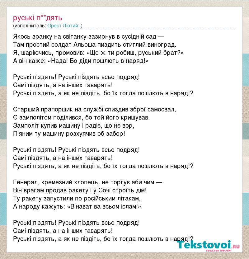 Якось зранку на світанку зазирнув в сусідній сад — Там простий солдат Альоша пиздить стиглий виноград. Я, шаріючись, промовив: «Що ж ти робиш, руський брат?» А він каже: «Нада! Бо діди пошлють в наряд!» Руські піздять! Руські піздять всьо подряд! Самі піздять, а на інших гаварять! Руські піздять, а як не піздіть, бо їх тогда пошлють в наряд!? Старший прапорщик на службі спиздив зброї самосвал, С замполітом поділився, бо той його кришував. Замполіт купив машину і радіє, що нє вор, П’яним ту машину розхуячив об забор! Руські піздять! Руські піздять всьо подряд! Самі піздять, а на інших гаварять! Руські піздять, а як не піздіть, бо їх тогда пошлють в наряд!? Генерал, кремезний хлопець, не торгує аби чим — Він врагам продав ракету і у Сочі строїть дім! Ту ракету запустили по російським літакам, А народу кажуть: «Вінават ва всьом іслам!» Руські піздять! Руські піздять всьо подряд! Самі піздять, а на інших гаварять! Руські піздять, а як не піздіть, бо їх тогда пошлють в наряд!?