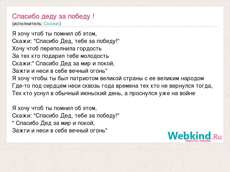 Я хочу чтоб ты помнил об этом, Скажи: "Спасибо Дед, тебе за победу!" Хочу чтоб переполнила гордость За тех кто подарил тебе молодость Cкажи:" Спасибо Дед за мир и покой, Зажги и неси в себе вечный огонь" Я хочу чтобы ты был патриотом великой страны с ее великим народом Где-то под сердцем неси сквозь года времена тех кто не вернулся тогда, Тех кто уснул в обычный июньский день, а проснулся уже на войне Я хочу чтоб ты помнил об этом, Скажи: "Спасибо Дед, тебе за победу!" " Спасибо Дед за мир и покой, Зажги и неси в себе вечный огонь"