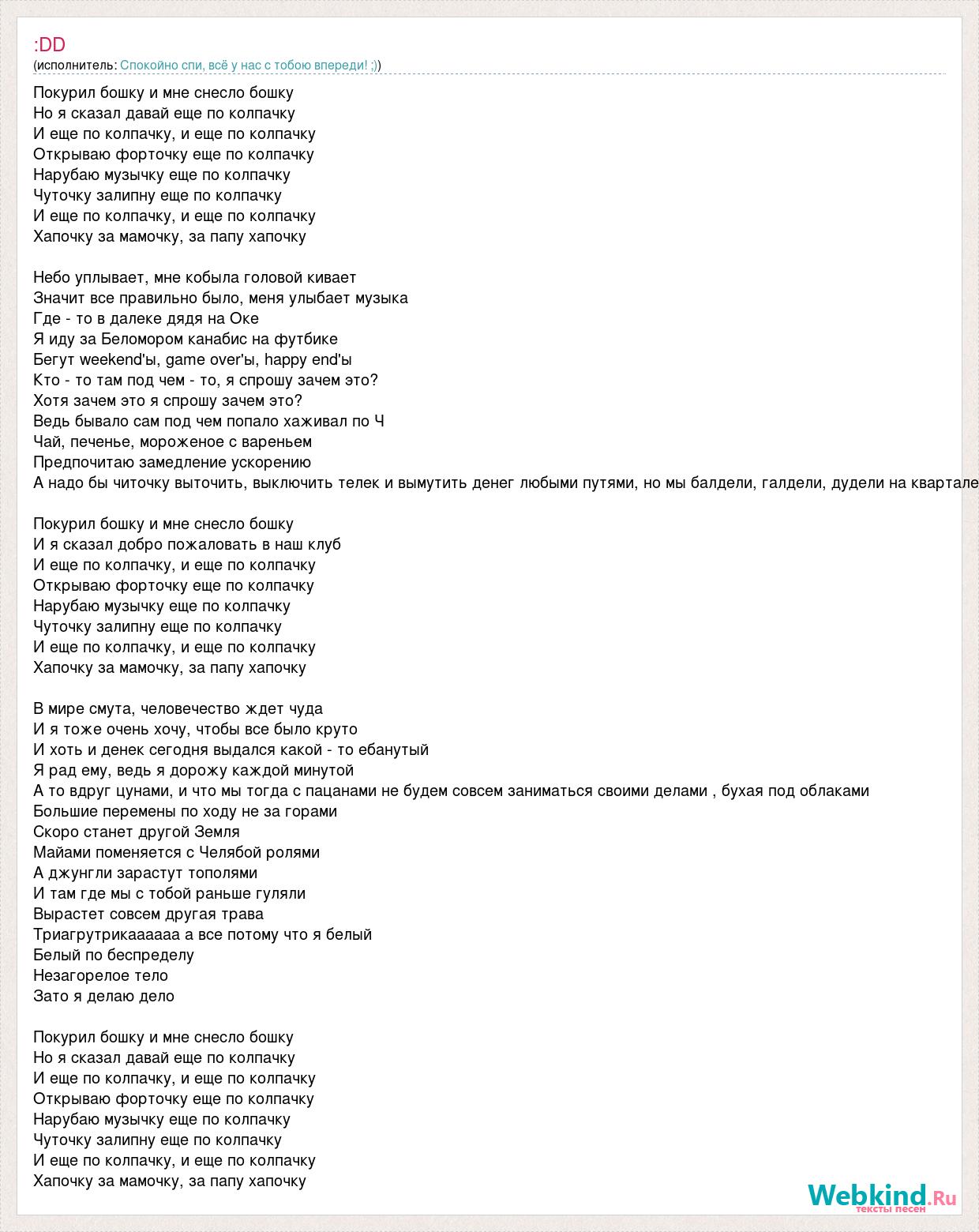 Покурил бошку и мне снесло бошку Но я сказал давай еще по колпачку И еще по колпачку, и еще по колпачку Открываю форточку еще по колпачку Нарубаю музычку еще по колпачку Чуточку залипну еще по колпачку И еще по колпачку, и еще по колпачку Хапочку за мамочку, за папу хапочку Небо уплывает, мне кобыла головой кивает Значит все правильно было, меня улыбает музыка Где - то в далеке дядя на Оке Я иду за Беломором канабис на футбике Бегут weekend'ы, game over'ы, happy end'ы Кто - то там под чем - то, я спрошу зачем это? Хотя зачем это я спрошу зачем это? Ведь бывало сам под чем попало хаживал по Ч Чай, печенье, мороженое с вареньем Предпочитаю замедление ускорению А надо бы читочку выточить, выключить телек и вымутить денег любыми путями, но мы балдели, галдели, дудели на квартале Покурил бошку и мне снесло бошку И я сказал добро пожаловать в наш клуб И еще по колпачку, и еще по колпачку Открываю форточку еще по колпачку Нарубаю музычку еще по колпачку Чуточку залипну еще по колпачку И еще по колпачку, и еще по колпачку Хапочку за мамочку, за папу хапочку В мире смута, человечество ждет чуда И я тоже очень хочу, чтобы все было круто И хоть и денек сегодня выдался какой - то ебанутый Я рад ему, ведь я дорожу каждой минутой А то вдруг цунами, и что мы тогда с пацанами не будем совсем заниматься своими делами , бухая под облаками Большие перемены по ходу не за горами Скоро станет другой Земля Майами поменяется с Челябой ролями А джунгли зарастут тополями И там где мы с тобой раньше гуляли Вырастет совсем другая трава Триагрутрикаааааа а все потому что я белый Белый по беспределу Незагорелое тело Зато я делаю дело Покурил бошку и мне снесло бошку Но я сказал давай еще по колпачку И еще по колпачку, и еще по колпачку Открываю форточку еще по колпачку Нарубаю музычку еще по колпачку Чуточку залипну еще по колпачку И еще по колпачку, и еще по колпачку Хапочку за мамочку, за папу хапочку