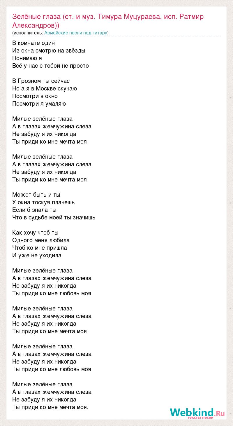В комнате один Из окна смотрю на звёзды Понимаю я Всё у нас с тобой не просто В Грозном ты сейчас Но а я в Москве скучаю Посмотри в окно Посмотри я умаляю Милые зелёные глаза А в глазах жемчужина слеза Не забуду я их никогда Ты приди ко мне мечта моя Милые зелёные глаза А в глазах жемчужина слеза Не забуду я их никогда Ты приди ко мне мечта моя Может быть и ты У окна тоскуя плачешь Если б знала ты Что в судьбе моей ты значишь Как хочу чтоб ты Одного меня любила Чтоб ко мне пришла И уже не уходила Милые зелёные глаза А в глазах жемчужина слеза Не забуду я их никогда Ты приди ко мне любовь моя Милые зелёные глаза А в глазах жемчужина слеза Не забуду я их никогда Ты приди ко мне мечта моя Милые зелёные глаза А в глазах жемчужина слеза Не забуду я их никогда Ты приди ко мне любовь моя Милые зелёные глаза А в глазах жемчужина слеза Не забуду я их никогда Ты приди ко мне мечта моя.