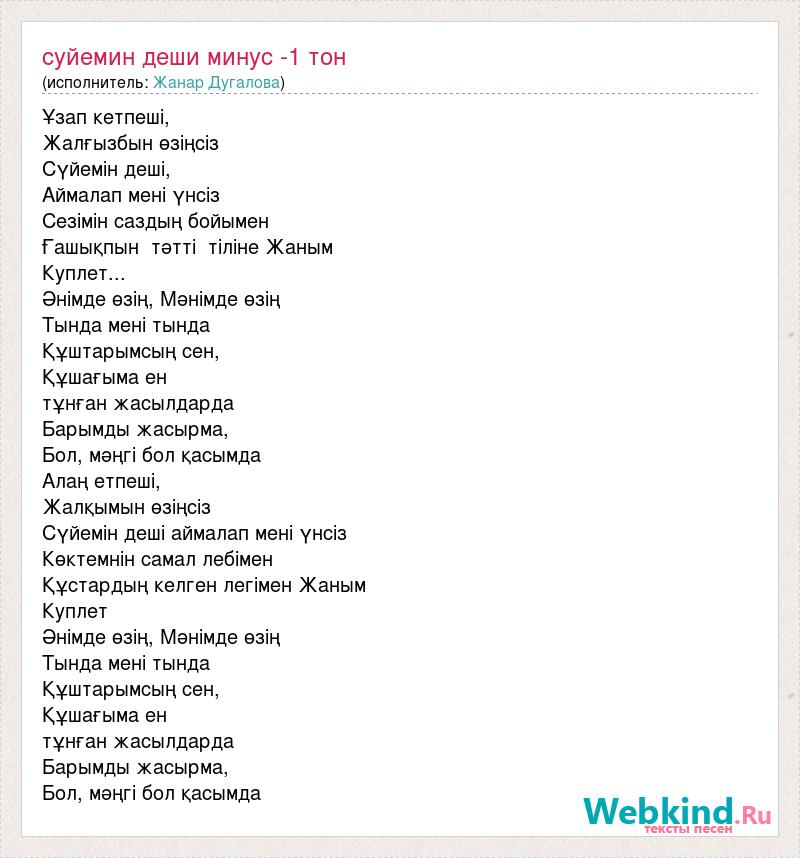 Ұзап кетпеші, Жалғызбын өзіңсіз Сүйемін деші, Аймалап мені үнсіз Сезімін саздың бойымен Ғашықпын тәтті тіліне Жаным Куплет... Әнімде өзің, Мәнімде өзің Тында мені тында Құштарымсың сен, Құшағыма ен тұнған жасылдарда Барымды жасырма, Бол, мәңгі бол қасымда Алаң етпеші, Жалқымын өзіңсіз Сүйемін деші аймалап мені үнсіз Көктемнін самал лебімен Құстардың келген легімен Жаным Куплет Әнімде өзің, Мәнімде өзің Тында мені тында Құштарымсың сен, Құшағыма ен тұнған жасылдарда Барымды жасырма, Бол, мәңгі бол қасымда