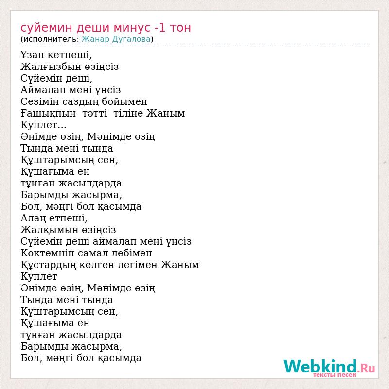 Ұзап кетпеші, Жалғызбын өзіңсіз Сүйемін деші, Аймалап мені үнсіз Сезімін саздың бойымен Ғашықпын тәтті тіліне Жаным Куплет... Әнімде өзің, Мәнімде өзің Тында мені тында Құштарымсың сен, Құшағыма ен тұнған жасылдарда Барымды жасырма, Бол, мәңгі бол қасымда Алаң етпеші, Жалқымын өзіңсіз Сүйемін деші аймалап мені үнсіз Көктемнін самал лебімен Құстардың келген легімен Жаным Куплет Әнімде өзің, Мәнімде өзің Тында мені тында Құштарымсың сен, Құшағыма ен тұнған жасылдарда Барымды жасырма, Бол, мәңгі бол қасымда