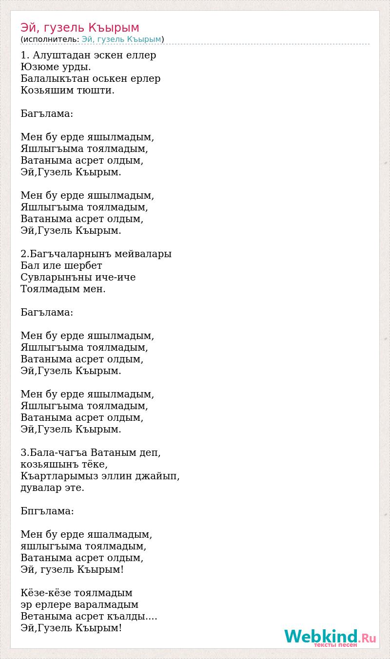 1. Алуштадан эскен еллер Юзюме урды. Балалыкътан оськен ерлер Козьяшим тюшти. Багълама: Мен бу ерде яшылмадым, Яшлыгъыма тоялмадым, Ватаныма асрет олдым, Эй,Гузель Къырым. Мен бу ерде яшылмадым, Яшлыгъыма тоялмадым, Ватаныма асрет олдым, Эй,Гузель Къырым. 2.Багъчаларнынъ мейвалары Бал иле шербет Сувларынъны иче-иче Тоялмадым мен. Багълама: Мен бу ерде яшылмадым, Яшлыгъыма тоялмадым, Ватаныма асрет олдым, Эй,Гузель Къырым. Мен бу ерде яшылмадым, Яшлыгъыма тоялмадым, Ватаныма асрет олдым, Эй,Гузель Къырым. 3.Бала-чагъа Ватаным деп, козьяшынъ тёке, Къартларымыз эллин джайып, дувалар эте. Бпгълама: Мен бу ерде яшалмадым, яшлыгъыма тоялмадым, Ватаныма асрет олдым, Эй, гузель Къырым! Кёзе-кёзе тоялмадым эр ерлере варалмадым Ветаныма асрет къалды.... Эй,Гузель Къырым!