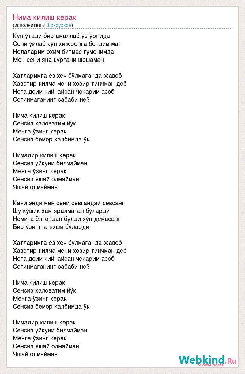 Кун ўтади бир амаллаб ўз ўрнида Сени ўйлаб кўп хижронга ботдим ман Нолаларим охим битмас гумонимда Мен сени яна кўргани шошаман Хатларимга ёз хеч бўлмаганда жавоб Хавотир килма мени хозир тинчман деб Нега доим кийнайсан чекарим азоб Согинмаганинг сабаби не? Нима килиш керак Сенсиз халоватим йук Менга ўзинг керак Сенсиз бемор калбимда ўк Нимадир килиш керак Сенсиз уйкуни билмайман Менга ўзинг керак Сенсиз яшай олмайман Яшай олмайман Кани энди мен сени севгандай севсанг Шу кўшик хам яралмаган бўларди Номига ёлгондан бўлди хўп демасанг Бир ўзингга яхши бўларди Хатларимга ёз хеч бўлмаганда жавоб Хавотир килма мени хозир тинчман деб Нега доим кийнайсан чекарим азоб Согинмаганинг сабаби не? Нима килиш керак Сенсиз халоватим йўк Менга ўзинг керак Сенсиз бемор калбимда ўк Нимадир килиш керак Сенсиз уйкуни билмайман Менга ўзинг керак Сенсиз яшай олмайман Яшай олмайман