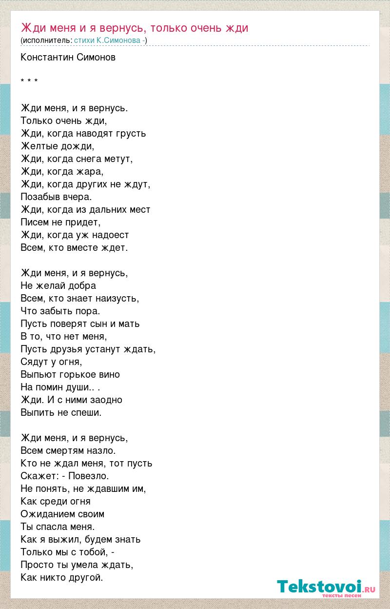 Константин Симонов * * * Жди меня, и я вернусь. Только очень жди, Жди, когда наводят грусть Желтые дожди, Жди, когда снега метут, Жди, когда жара, Жди, когда других не ждут, Позабыв вчера. Жди, когда из дальних мест Писем не придет, Жди, когда уж надоест Всем, кто вместе ждет. Жди меня, и я вернусь, Не желай добра Всем, кто знает наизусть, Что забыть пора. Пусть поверят сын и мать В то, что нет меня, Пусть друзья устанут ждать, Сядут у огня, Выпьют горькое вино На помин души.. . Жди. И с ними заодно Выпить не спеши. Жди меня, и я вернусь, Всем смертям назло. Кто не ждал меня, тот пусть Скажет: - Повезло. Не понять, не ждавшим им, Как среди огня Ожиданием своим Ты спасла меня. Как я выжил, будем знать Только мы с тобой, - Просто ты умела ждать, Как никто другой.