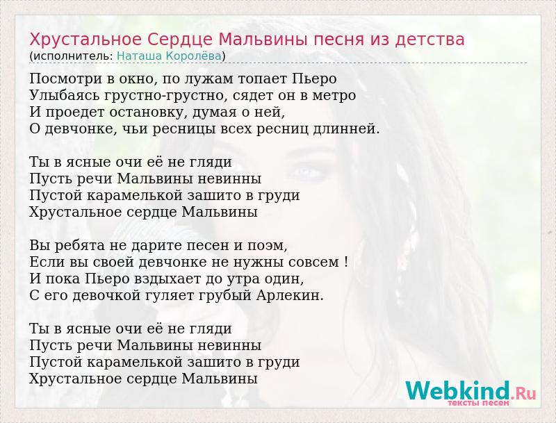 Посмотри в окно, по лужам топает Пьеро Улыбаясь грустно-грустно, сядет он в метро И проедет остановку, думая о ней, О девчонке, чьи ресницы всех ресниц длинней. Ты в ясные очи её не гляди Пусть речи Мальвины невинны Пустой карамелькой зашито в груди Хрустальное сердце Мальвины Вы ребята не дарите песен и поэм, Если вы своей девчонке не нужны совсем ! И пока Пьеро вздыхает до утра один, С его девочкой гуляет грубый Арлекин. Ты в ясные очи её не гляди Пусть речи Мальвины невинны Пустой карамелькой зашито в груди Хрустальное сердце Мальвины