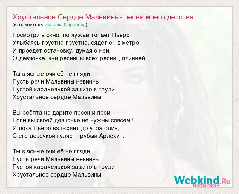 Посмотри в окно, по лужам топает Пьеро Улыбаясь грустно-грустно, сядет он в метро И проедет остановку, думая о ней, О девчонке, чьи ресницы всех ресниц длинней. Ты в ясные очи её не гляди Пусть речи Мальвины невинны Пустой карамелькой зашито в груди Хрустальное сердце Мальвины Вы ребята не дарите песен и поэм, Если вы своей девчонке не нужны совсем ! И пока Пьеро вздыхает до утра один, С его девочкой гуляет грубый Арлекин. Ты в ясные очи её не гляди Пусть речи Мальвины невинны Пустой карамелькой зашито в груди Хрустальное сердце Мальвины