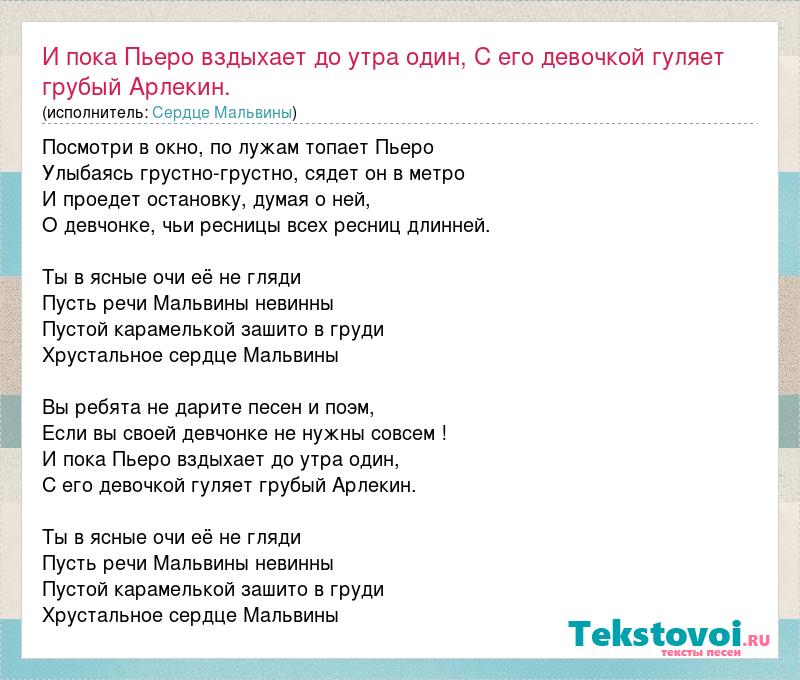 Посмотри в окно, по лужам топает Пьеро Улыбаясь грустно-грустно, сядет он в метро И проедет остановку, думая о ней, О девчонке, чьи ресницы всех ресниц длинней. Ты в ясные очи её не гляди Пусть речи Мальвины невинны Пустой карамелькой зашито в груди Хрустальное сердце Мальвины Вы ребята не дарите песен и поэм, Если вы своей девчонке не нужны совсем ! И пока Пьеро вздыхает до утра один, С его девочкой гуляет грубый Арлекин. Ты в ясные очи её не гляди Пусть речи Мальвины невинны Пустой карамелькой зашито в груди Хрустальное сердце Мальвины