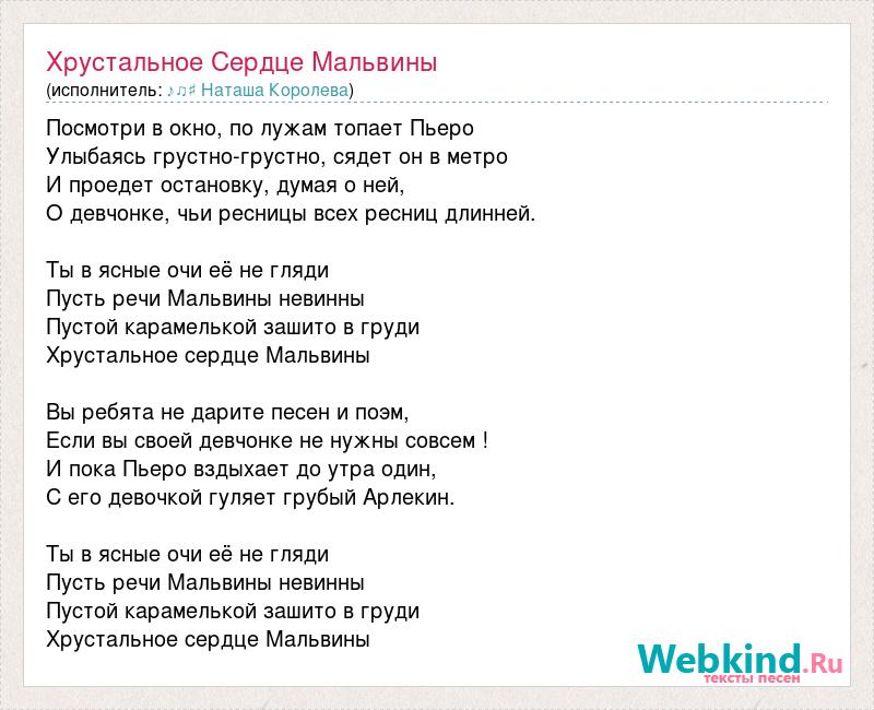 Посмотри в окно, по лужам топает Пьеро Улыбаясь грустно-грустно, сядет он в метро И проедет остановку, думая о ней, О девчонке, чьи ресницы всех ресниц длинней. Ты в ясные очи её не гляди Пусть речи Мальвины невинны Пустой карамелькой зашито в груди Хрустальное сердце Мальвины Вы ребята не дарите песен и поэм, Если вы своей девчонке не нужны совсем ! И пока Пьеро вздыхает до утра один, С его девочкой гуляет грубый Арлекин. Ты в ясные очи её не гляди Пусть речи Мальвины невинны Пустой карамелькой зашито в груди Хрустальное сердце Мальвины