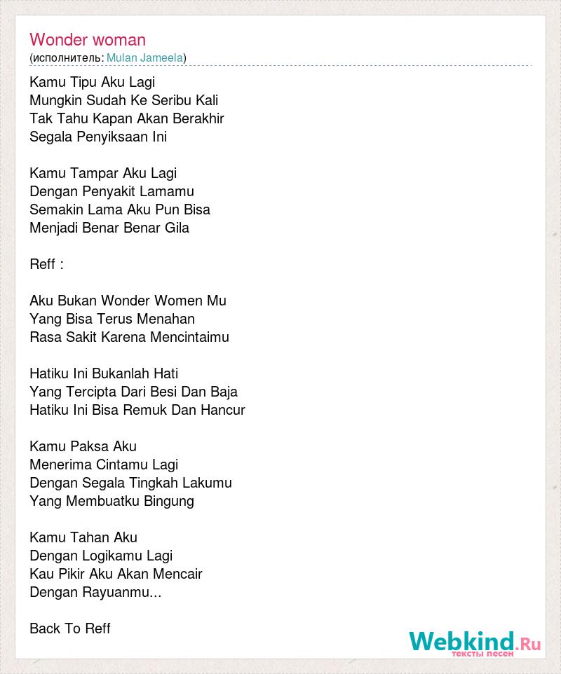 Kamu Tipu Aku Lagi Mungkin Sudah Ke Seribu Kali Tak Tahu Kapan Akan Berakhir Segala Penyiksaan Ini Kamu Tampar Aku Lagi Dengan Penyakit Lamamu Semakin Lama Aku Pun Bisa Menjadi Benar Benar Gila Reff : Aku Bukan Wonder Women Mu Yang Bisa Terus Menahan Rasa Sakit Karena Mencintaimu Hatiku Ini Bukanlah Hati Yang Tercipta Dari Besi Dan Baja Hatiku Ini Bisa Remuk Dan Hancur Kamu Paksa Aku Menerima Cintamu Lagi Dengan Segala Tingkah Lakumu Yang Membuatku Bingung Kamu Tahan Aku Dengan Logikamu Lagi Kau Pikir Aku Akan Mencair Dengan Rayuanmu... Back To Reff