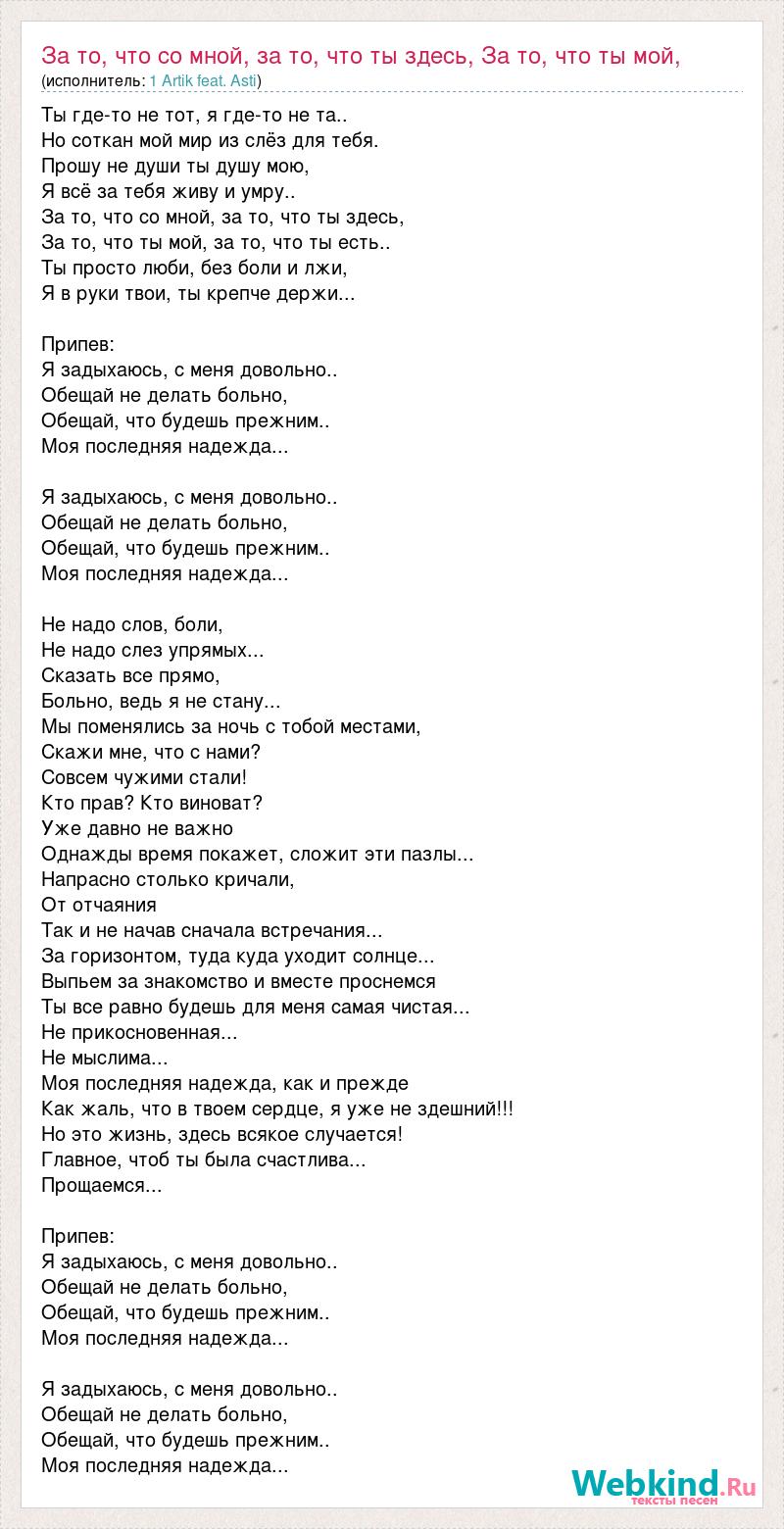 Ты где-то не тот, я где-то не та.. Но соткан мой мир из слёз для тебя. Прошу не души ты душу мою, Я всё за тебя живу и умру.. За то, что со мной, за то, что ты здесь, За то, что ты мой, за то, что ты есть.. Ты просто люби, без боли и лжи, Я в руки твои, ты крепче держи... Припев: Я задыхаюсь, с меня довольно.. Обещай не делать больно, Обещай, что будешь прежним.. Моя последняя надежда... Я задыхаюсь, с меня довольно.. Обещай не делать больно, Обещай, что будешь прежним.. Моя последняя надежда... Не надо слов, боли, Не надо слез упрямых... Сказать все прямо, Больно, ведь я не стану... Мы поменялись за ночь с тобой местами, Скажи мне, что с нами? Совсем чужими стали! Кто прав? Кто виноват? Уже давно не важно Однажды время покажет, сложит эти пазлы... Напрасно столько кричали, От отчаяния Так и не начав сначала встречания... За горизонтом, туда куда уходит солнце... Выпьем за знакомство и вместе проснемся Ты все равно будешь для меня самая чистая... Не прикосновенная... Не мыслима... Моя последняя надежда, как и прежде Как жаль, что в твоем сердце, я уже не здешний!!! Но это жизнь, здесь всякое случается! Главное, чтоб ты была счастлива... Прощаемся... Припев: Я задыхаюсь, с меня довольно.. Обещай не делать больно, Обещай, что будешь прежним.. Моя последняя надежда... Я задыхаюсь, с меня довольно.. Обещай не делать больно, Обещай, что будешь прежним.. Моя последняя надежда...