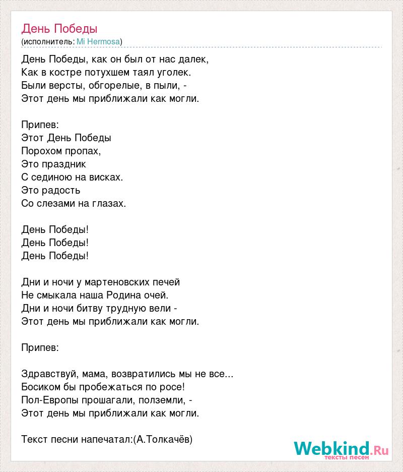 День Победы, как он был от нас далек, Как в костре потухшем таял уголек. Были версты, обгорелые, в пыли, - Этот день мы приближали как могли. Припев: Этот День Победы Порохом пропах, Это праздник С сединою на висках. Это радость Со слезами на глазах. День Победы! День Победы! День Победы! Дни и ночи у мартеновских печей Не смыкала наша Родина очей. Дни и ночи битву трудную вели - Этот день мы приближали как могли. Припев: Здравствуй, мама, возвратились мы не все... Босиком бы пробежаться по росе! Пол-Европы прошагали, полземли, - Этот день мы приближали как могли. Текст песни напечатал:(А.Толкачёв)