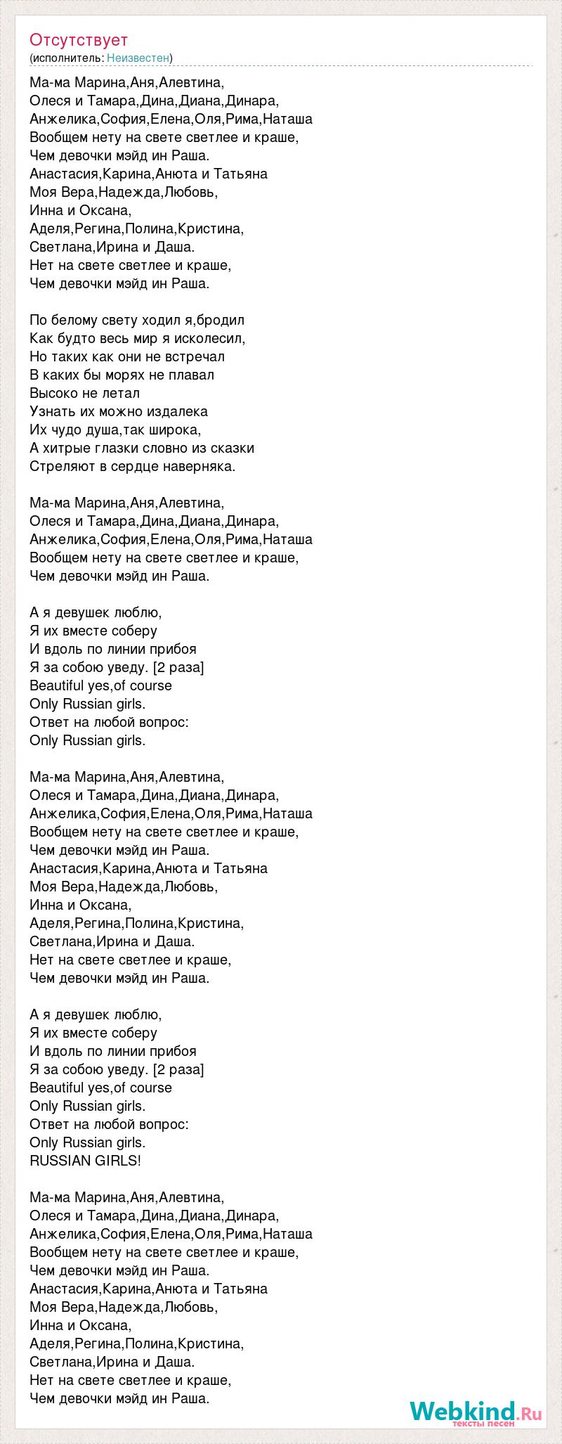 Ма-ма Марина,Аня,Алевтина, Олеся и Тамара,Дина,Диана,Динара, Анжелика,София,Елена,Оля,Рима,Наташа Вообщем нету на свете светлее и краше, Чем девочки мэйд ин Раша. Анастасия,Карина,Анюта и Татьяна Моя Вера,Надежда,Любовь, Инна и Оксана, Аделя,Регина,Полина,Кристина, Светлана,Ирина и Даша. Нет на свете светлее и краше, Чем девочки мэйд ин Раша. По белому свету ходил я,бродил Как будто весь мир я исколесил, Но таких как они не встречал В каких бы морях не плавал Высоко не летал Узнать их можно издалека Их чудо душа,так широка, А хитрые глазки словно из сказки Стреляют в сердце наверняка. Ма-ма Марина,Аня,Алевтина, Олеся и Тамара,Дина,Диана,Динара, Анжелика,София,Елена,Оля,Рима,Наташа Вообщем нету на свете светлее и краше, Чем девочки мэйд ин Раша. А я девушек люблю, Я их вместе соберу И вдоль по линии прибоя Я за собою уведу. [2 раза] Beautiful yes,of course Only Russian girls. Ответ на любой вопрос: Only Russian girls. Ма-ма Марина,Аня,Алевтина, Олеся и Тамара,Дина,Диана,Динара, Анжелика,София,Елена,Оля,Рима,Наташа Вообщем нету на свете светлее и краше, Чем девочки мэйд ин Раша. Анастасия,Карина,Анюта и Татьяна Моя Вера,Надежда,Любовь, Инна и Оксана, Аделя,Регина,Полина,Кристина, Светлана,Ирина и Даша. Нет на свете светлее и краше, Чем девочки мэйд ин Раша. А я девушек люблю, Я их вместе соберу И вдоль по линии прибоя Я за собою уведу. [2 раза] Beautiful yes,of course Only Russian girls. Ответ на любой вопрос: Only Russian girls. RUSSIAN GIRLS! Ма-ма Марина,Аня,Алевтина, Олеся и Тамара,Дина,Диана,Динара, Анжелика,София,Елена,Оля,Рима,Наташа Вообщем нету на свете светлее и краше, Чем девочки мэйд ин Раша. Анастасия,Карина,Анюта и Татьяна Моя Вера,Надежда,Любовь, Инна и Оксана, Аделя,Регина,Полина,Кристина, Светлана,Ирина и Даша. Нет на свете светлее и краше, Чем девочки мэйд ин Раша.