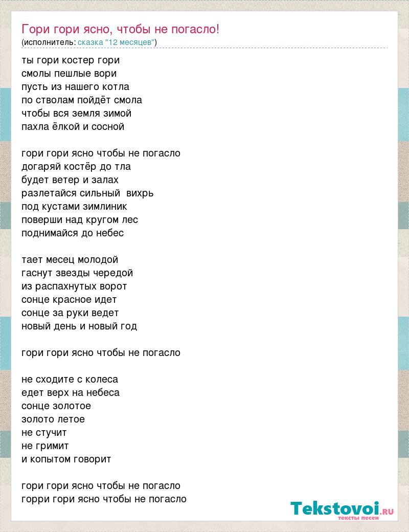 ты гори костер гори смолы пешлые вори пусть из нашего котла по стволам пойдёт смола чтобы вся земля зимой пахла ёлкой и сосной гори гори ясно чтобы не погасло догаряй костёр до тла будет ветер и залах разлетайся сильный вихрь под кустами зимлиник поверши над кругом лес поднимайся до небес тает месец молодой гаснут звезды чередой из распахнутых ворот сонце красное идет сонце за руки ведет новый день и новый год гори гори ясно чтобы не погасло не сходите с колеса едет верх на небеса сонце золотое золото летое не стучит не гримит и копытом говорит гори гори ясно чтобы не погасло горри гори ясно чтобы не погасло