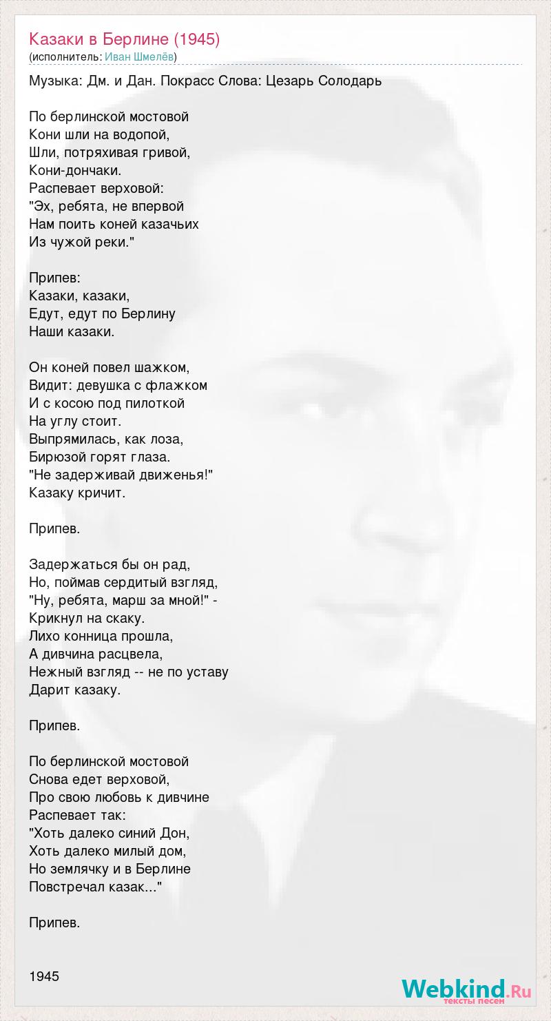 Музыка: Дм. и Дан. Покрасс Слова: Цезарь Солодарь По берлинской мостовой Кони шли на водопой, Шли, потряхивая гривой, Кони-дончаки. Распевает верховой: "Эх, ребята, не впервой Нам поить коней казачьих Из чужой реки." Припев: Казаки, казаки, Едут, едут по Берлину Наши казаки. Он коней повел шажком, Видит: девушка с флажком И с косою под пилоткой На углу стоит. Выпрямилась, как лоза, Бирюзой горят глаза. "Не задерживай движенья!" Казаку кричит. Припев. Задержаться бы он рад, Но, поймав сердитый взгляд, "Ну, ребята, марш за мной!" - Крикнул на скаку. Лихо конница прошла, А дивчина расцвела, Нежный взгляд -- не по уставу Дарит казаку. Припев. По берлинской мостовой Снова едет верховой, Про свою любовь к дивчине Распевает так: "Хоть далеко синий Дон, Хоть далеко милый дом, Но землячку и в Берлине Повстречал казак..." Припев. 1945
