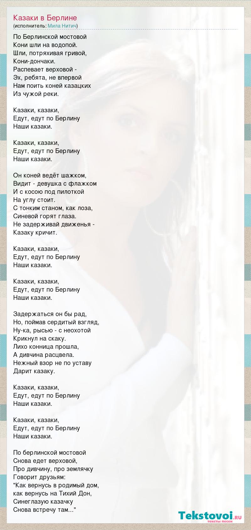 По Берлинской мостовой Кони шли на водопой. Шли, потряхивая гривой, Кони-дончаки. Распевает верховой - Эх, ребята, не впервой Нам поить коней казацких Из чужой реки. Казаки, казаки, Едут, едут по Берлину Наши казаки. Казаки, казаки, Едут, едут по Берлину Наши казаки. Он коней ведёт шажком, Видит - девушка с флажком И с косою под пилоткой На углу стоит. С тонким станом, как лоза, Синевой горят глаза. Не задерживай движенья - Казаку кричит. Казаки, казаки, Едут, едут по Берлину Наши казаки. Казаки, казаки, Едут, едут по Берлину Наши казаки. Задержаться он бы рад, Но, поймав сердитый взгляд, Ну-ка, рысью - с неохотой Крикнул на скаку. Лихо конница прошла, А дивчина расцвела. Нежный взор не по уставу Дарит казаку. Казаки, казаки, Едут, едут по Берлину Наши казаки. Казаки, казаки, Едут, едут по Берлину Наши казаки. По берлинской мостовой Снова едет верховой, Про дивчину, про землячку Говорит друзьям: "Как вернусь в родимый дом, как вернусь на Тихий Дон, Синеглазую казачку Снова встречу там..."