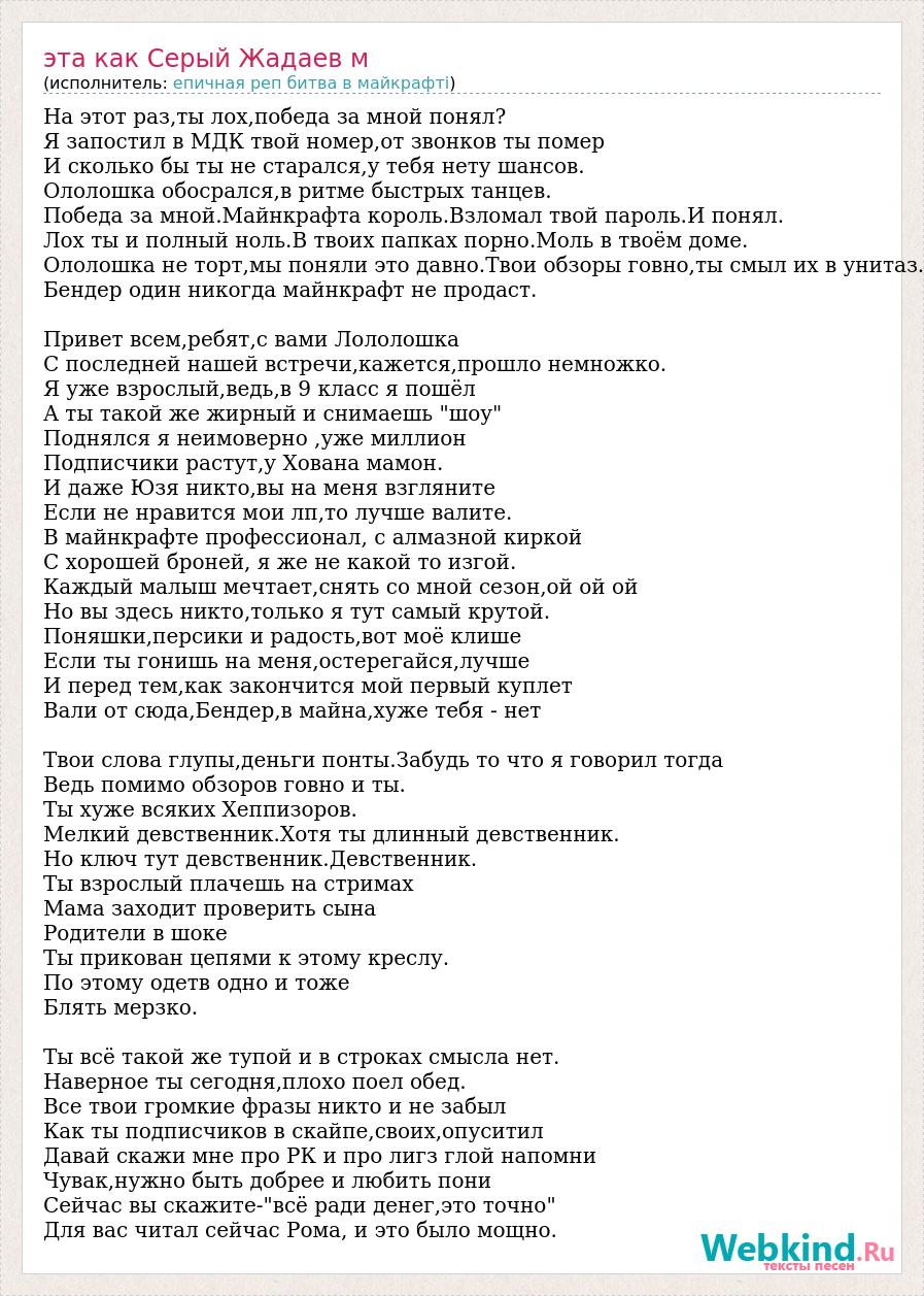 На этот раз,ты лох,победа за мной понял? Я запостил в МДК твой номер,от звонков ты помер И сколько бы ты не старался,у тебя нету шансов. Ололошка обосрался,в ритме быстрых танцев. Победа за мной.Майнкрафта король.Взломал твой пароль.И понял. Лох ты и полный ноль.В твоих папках порно.Моль в твоём доме. Ололошка не торт,мы поняли это давно.Твои обзоры говно,ты смыл их в унитаз. Бендер один никогда майнкрафт не продаст. Привет всем,ребят,с вами Лололошка С последней нашей встречи,кажется,прошло немножко. Я уже взрослый,ведь,в 9 класс я пошёл А ты такой же жирный и снимаешь "шоу" Поднялся я неимоверно ,уже миллион Подписчики растут,у Хована мамон. И даже Юзя никто,вы на меня взгляните Если не нравится мои лп,то лучше валите. В майнкрафте профессионал, с алмазной киркой С хорошей броней, я же не какой то изгой. Каждый малыш мечтает,снять со мной сезон,ой ой ой Но вы здесь никто,только я тут самый крутой. Поняшки,персики и радость,вот моё клише Если ты гонишь на меня,остерегайся,лучше И перед тем,как закончится мой первый куплет Вали от сюда,Бендер,в майна,хуже тебя - нет Твои слова глупы,деньги понты.Забудь то что я говорил тогда Ведь помимо обзоров говно и ты. Ты хуже всяких Хеппизоров. Мелкий девственник.Хотя ты длинный девственник. Но ключ тут девственник.Девственник. Ты взрослый плачешь на стримах Мама заходит проверить сына Родители в шоке Ты прикован цепями к этому креслу. По этому одетв одно и тоже Блять мерзко. Ты всё такой же тупой и в строках смысла нет. Наверное ты сегодня,плохо поел обед. Все твои громкие фразы никто и не забыл Как ты подписчиков в скайпе,своих,опуситил Давай скажи мне про РК и про лигз глой напомни Чувак,нужно быть добрее и любить пони Сейчас вы скажите-"всё ради денег,это точно" Для вас читал сейчас Рома, и это было мощно.