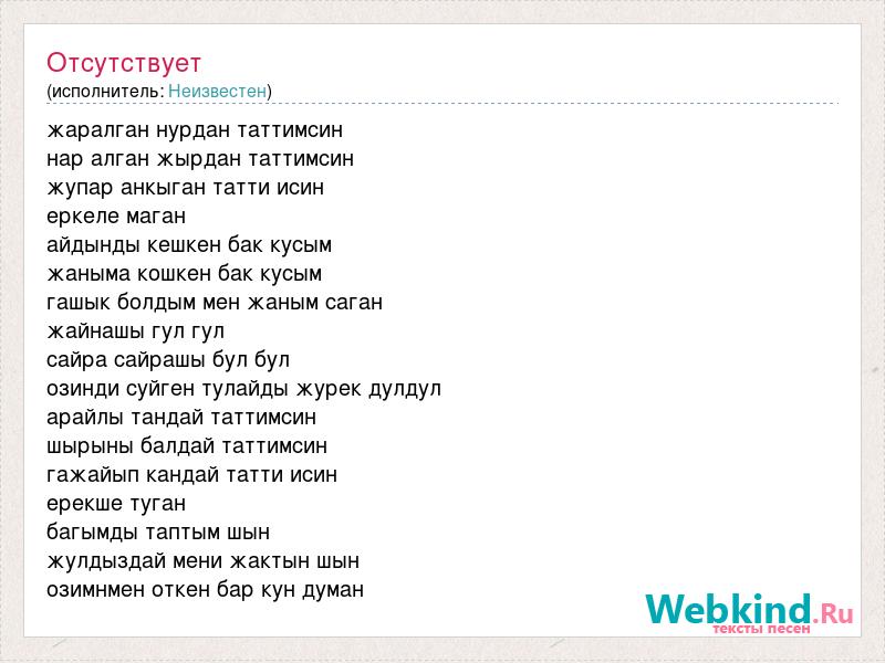 жаралган нурдан таттимсин нар алган жырдан таттимсин жупар анкыган татти исин еркеле маган айдынды кешкен бак кусым жаныма кошкен бак кусым гашык болдым мен жаным саган жайнашы гул гул сайра сайрашы бул бул озинди суйген тулайды журек дулдул арайлы тандай таттимсин шырыны балдай таттимсин гажайып кандай татти исин ерекше туган багымды таптым шын жулдыздай мени жактын шын озимнмен откен бар кун думан