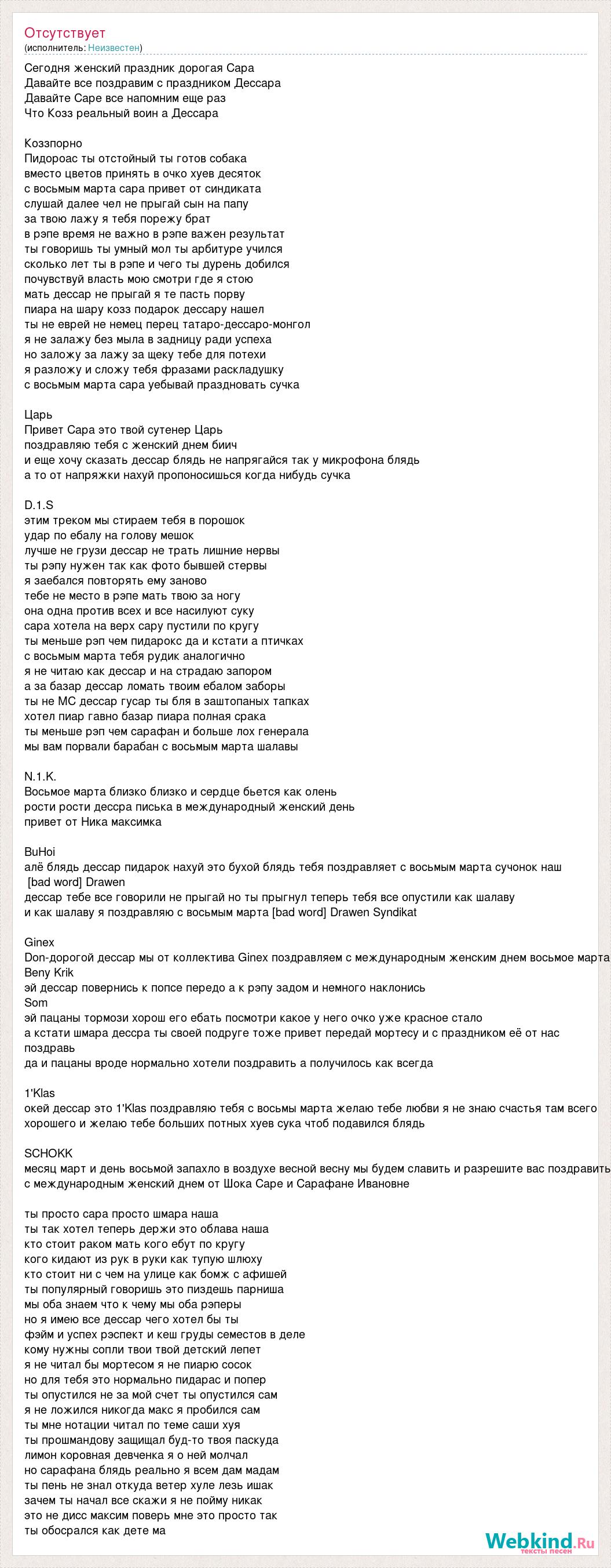 Сегодня женский праздник дорогая Сара Давайте все поздравим с праздником Дессара Давайте Саре все напомним еще раз Что Козз реальный воин а Дессара Коззпорно Пидороас ты отстойный ты готов собака вместо цветов принять в очко хуев десяток с восьмым марта сара привет от синдиката слушай далее чел не прыгай сын на папу за твою лажу я тебя порежу брат в рэпе время не важно в рэпе важен результат ты говоришь ты умный мол ты арбитуре учился сколько лет ты в рэпе и чего ты дурень добился почувствуй власть мою смотри где я стою мать дессар не прыгай я те пасть порву пиара на шару козз подарок дессару нашел ты не еврей не немец перец татаро-дессаро-монгол я не залажу без мыла в задницу ради успеха но заложу за лажу за щеку тебе для потехи я разложу и сложу тебя фразами раскладушку с восьмым марта сара уебывай праздновать сучка Царь Привет Сара это твой сутенер Царь поздравляю тебя с женский днем биич и еще хочу сказать дессар блядь не напрягайся так у микрофона блядь а то от напряжки нахуй пропоносишься когда нибудь сучка D.1.S этим треком мы стираем тебя в порошок удар по ебалу на голову мешок лучше не грузи дессар не трать лишние нервы ты рэпу нужен так как фото бывшей стервы я заебался повторять ему заново тебе не место в рэпе мать твою за ногу она одна против всех и все насилуют суку сара хотела на верх сару пустили по кругу ты меньше рэп чем пидарокс да и кстати а птичках с восьмым марта тебя рудик аналогично я не читаю как дессар и на страдаю запором а за базар дессар ломать твоим ебалом заборы ты не МС дессар гусар ты бля в заштопаных тапках хотел пиар гавно базар пиара полная срака ты меньше рэп чем сарафан и больше лох генерала мы вам порвали барабан с восьмым марта шалавы N.1.K. Восьмое марта близко близко и сердце бьется как олень рости рости дессра писька в международный женский день привет от Ника максимка BuHoi алё блядь дессар пидарок нахуй это бухой блядь тебя поздравляет с восьмым марта сучонок наш [bad word] Drawen дессар тебе все говорили не прыгай но ты прыгнул теперь тебя все опустили как шалаву и как шалаву я поздравляю с восьмым марта [bad word] Drawen Syndikat Ginex Don-дорогой дессар мы от коллектива Ginex поздравляем с международным женским днем восьмое марта Beny Krik эй дессар повернись к попсе передо а к рэпу задом и немного наклонись Som эй пацаны тормози хорош его ебать посмотри какое у него очко уже красное стало а кстати шмара дессра ты своей подруге тоже привет передай мортесу и с праздником её от нас поздравь да и пацаны вроде нормально хотели поздравить а получилось как всегда 1'Klas окей дессар это 1'Klas поздравляю тебя с восьмы марта желаю тебе любви я не знаю счастья там всего хорошего и желаю тебе больших потных хуев сука чтоб подавился блядь SCHOKK месяц март и день восьмой запахло в воздухе весной весну мы будем славить и разрешите вас поздравить с международным женский днем от Шока Саре и Сарафане Ивановне ты просто сара просто шмара наша ты так хотел теперь держи это облава наша кто стоит раком мать кого ебут по кругу кого кидают из рук в руки как тупую шлюху кто стоит ни с чем на улице как бомж с афишей ты популярный говоришь это пиздешь парниша мы оба знаем что к чему мы оба рэперы но я имею все дессар чего хотел бы ты фэйм и успех рэспект и кеш груды семестов в деле кому нужны сопли твои твой детский лепет я не читал бы мортесом я не пиарю сосок но д
