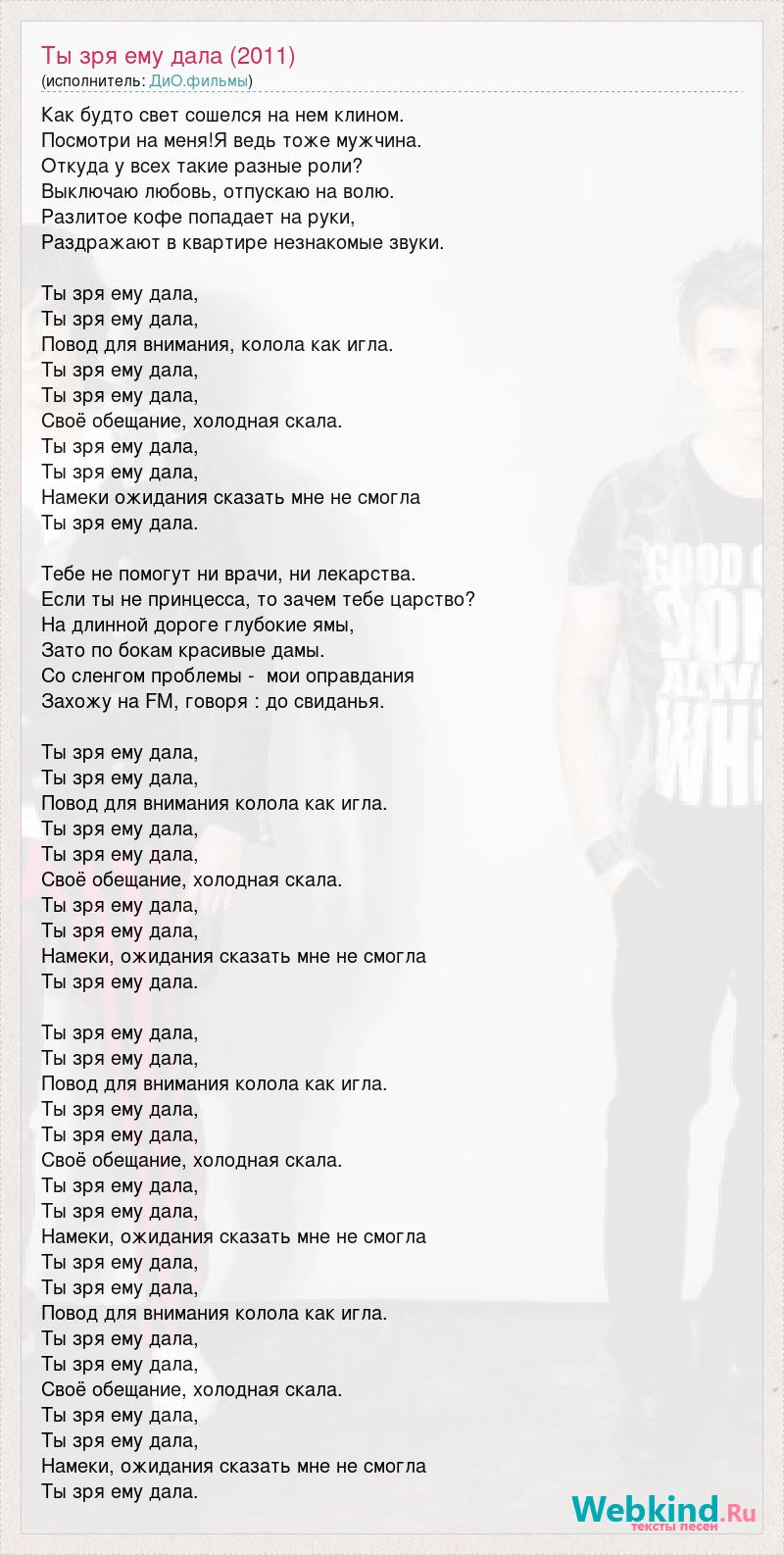 Как будто свет сошелся на нем клином. Посмотри на меня!Я ведь тоже мужчина. Откуда у всех такие разные роли? Выключаю любовь, отпускаю на волю. Разлитое кофе попадает на руки, Раздражают в квартире незнакомые звуки. Ты зря ему дала, Ты зря ему дала, Повод для внимания, колола как игла. Ты зря ему дала, Ты зря ему дала, Своё обещание, холодная скала. Ты зря ему дала, Ты зря ему дала, Намеки ожидания сказать мне не смогла Ты зря ему дала. Тебе не помогут ни врачи, ни лекарства. Если ты не принцесса, то зачем тебе царство? На длинной дороге глубокие ямы, Зато по бокам красивые дамы. Со сленгом проблемы - мои оправдания Захожу на FM, говоря : до свиданья. Ты зря ему дала, Ты зря ему дала, Повод для внимания колола как игла. Ты зря ему дала, Ты зря ему дала, Своё обещание, холодная скала. Ты зря ему дала, Ты зря ему дала, Намеки, ожидания сказать мне не смогла Ты зря ему дала. Ты зря ему дала, Ты зря ему дала, Повод для внимания колола как игла. Ты зря ему дала, Ты зря ему дала, Своё обещание, холодная скала. Ты зря ему дала, Ты зря ему дала, Намеки, ожидания сказать мне не смогла Ты зря ему дала, Ты зря ему дала, Повод для внимания колола как игла. Ты зря ему дала, Ты зря ему дала, Своё обещание, холодная скала. Ты зря ему дала, Ты зря ему дала, Намеки, ожидания сказать мне не смогла Ты зря ему дала.
