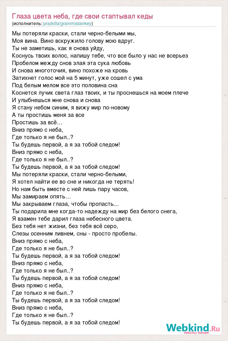 Мы потеряли краски, стали черно-белыми мы, Моя вина. Вино вскружило голову мою вдруг. Ты не заметишь, как я снова уйду, Коснусь твоих волос, напишу тебе, что все было у нас не всерьез Пробелом между снов злая эта сука любовь И снова многоточия, вино похоже на кровь Затихнет голос мой на 5 минут, уже сошел с ума Под белым мелом все это половина сна Коснется лучик света глаз твоих, и ты проснешься на моем плече И улыбнешься мне снова и снова Я стану небом синим, я вижу мир по-новому А ты простишь меня за все Простишь за всё… Вниз прямо с неба, Где только я не был..? Ты будешь первой, а я за тобой следом! Вниз прямо с неба, Где только я не был..? Ты будешь первой, а я за тобой следом! Мы потеряли краски, стали черно-белыми, Я хотел найти ее во сне и никогда не терять! Но нам быть вместе с ней лишь пару часов, Мы замираем опять… Мы закрываем глаза, чтобы пропасть... Ты подарила мне когда-то надежду на мир без белого снега, Я взамен тебе дарил глаза небесного цвета. Без тебя нет жизни, без тебя всё серо, Слезы осенним ливнем, сны - просто пробелы. Вниз прямо с неба, Где только я не был..? Ты будешь первой, а я за тобой следом! Вниз прямо с неба, Где только я не был..? Ты будешь первой, а я за тобой следом! Вниз прямо с неба, Где только я не был..? Ты будешь первой, а я за тобой следом! Вниз прямо с неба, Где только я не был..? Ты будешь первой, а я за тобой следом!