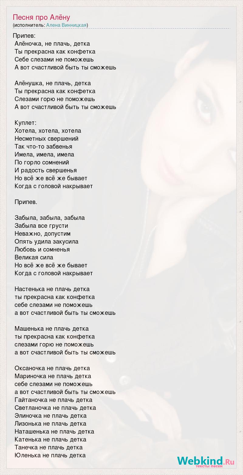 Припев: Алёночка, не плачь, детка Ты прекрасна как конфетка Себе слезами не поможешь А вот счастливой быть ты сможешь Алёнушка, не плачь, детка Ты прекрасна как конфетка Слезами горю не поможешь А вот счастливой быть ты сможешь Куплет: Хотела, хотела, хотела Несметных свершений Так что-то забвенья Имела, имела, имела По горло сомнений И радость свершенья Но всё же всё же бывает Когда с головой накрывает Припев. Забыла, забыла, забыла Забыла все грусти Неважно, допустим Опять удила закусила Любовь и сомненья Великая сила Но всё же всё же бывает Когда с головой накрывает Настенька не плачь детка ты прекрасна как конфетка себе слезами не поможешь а вот счастливой быть ты сможешь Машенька не плачь детка ты прекрасна как конфетка слезами горю не поможешь а вот счастливой быть ты сможешь Оксаночка не плачь детка Мариночка не плачь детка себе слезами не поможешь а вот счастливой быть ты сможешь Гайтаночка не плачь детка Светланочка не плачь детка Элиночка не плачь детка Лизонька не плачь детка Наташенька не плачь детка Катенька не плачь детка Танечка не плачь детка Юленька не плачь детка