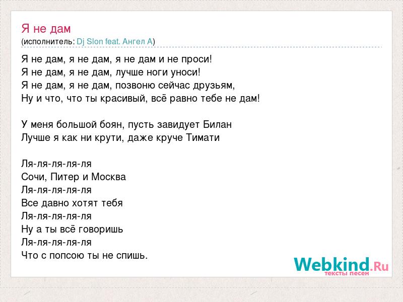 Я не дам, я не дам, я не дам и не проси! Я не дам, я не дам, лучше ноги уноси! Я не дам, я не дам, позвоню сейчас друзьям, Ну и что, что ты красивый, всё равно тебе не дам! У меня большой боян, пусть завидует Билан Лучше я как ни крути, даже круче Тимати Ля-ля-ля-ля-ля Сочи, Питер и Москва Ля-ля-ля-ля-ля Все давно хотят тебя Ля-ля-ля-ля-ля Ну а ты всё говоришь Ля-ля-ля-ля-ля Что с попсою ты не спишь.