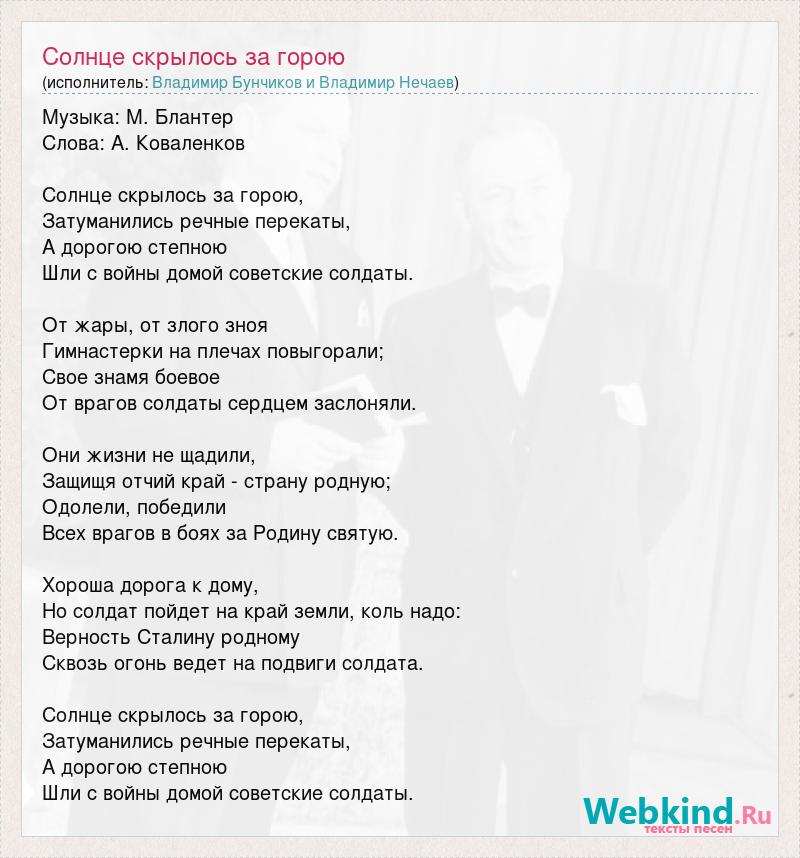 Музыка: М. Блантер Слова: А. Коваленков Солнце скрылось за горою, Затуманились речные перекаты, А дорогою степною Шли с войны домой советские солдаты. От жары, от злого зноя Гимнастерки на плечах повыгорали; Свое знамя боевое От врагов солдаты сердцем заслоняли. Они жизни не щадили, Защищя отчий край - страну родную; Одолели, победили Всех врагов в боях за Родину святую. Хороша дорога к дому, Но солдат пойдет на край земли, коль надо: Верность Сталину родному Сквозь огонь ведет на подвиги солдата. Солнце скрылось за горою, Затуманились речные перекаты, А дорогою степною Шли с войны домой советские солдаты.