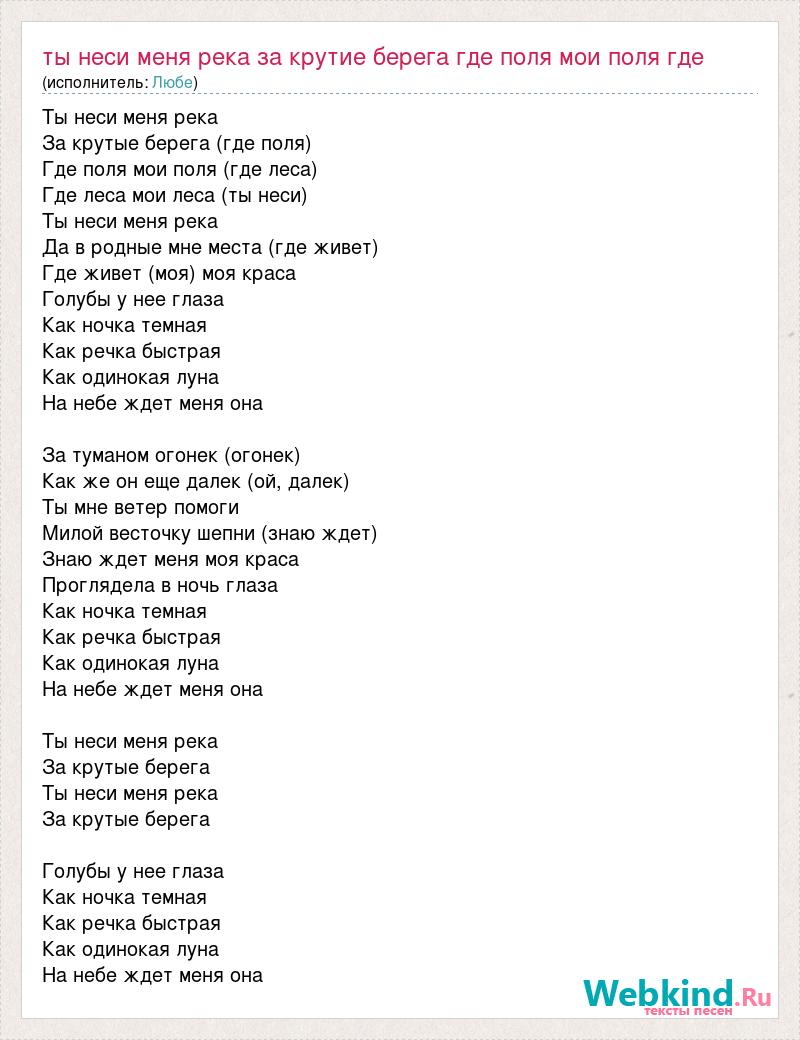 Ты неси меня река За крутые берега (где поля) Где поля мои поля (где леса) Где леса мои леса (ты неси) Ты неси меня река Да в родные мне места (где живет) Где живет (моя) моя краса Голубы у нее глаза Как ночка темная Как речка быстрая Как одинокая луна На небе ждет меня она За туманом огонек (огонек) Как же он еще далек (ой, далек) Ты мне ветер помоги Милой весточку шепни (знаю ждет) Знаю ждет меня моя краса Проглядела в ночь глаза Как ночка темная Как речка быстрая Как одинокая луна На небе ждет меня она Ты неси меня река За крутые берега Ты неси меня река За крутые берега Голубы у нее глаза Как ночка темная Как речка быстрая Как одинокая луна На небе ждет меня она
