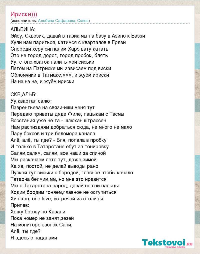 АЛЬБИНА: Эйеу, Сквозик, давай в тазик,мы на базу в Азино к Баззи Хули нам париться, катимся с кварталов в Грязи Спереди херу сигналим-Харэ вату катать Это не город дорог, город пробок, блять Уу, стопэ,хваток палить мои сиськи Летом на Патриске мы зависаем под виски Обломчики в Татмаке,ммм, и жуём ириски Нэ нэ нэ нэ, и жуём ириски СКВ,АЛЬБ: Уу,квартал салют Лаврентьева на связи-ищи меня тут Передаю приветы дяде Филе, пацыкам с Тасмы Восстания уже не та - шлюхан штрассен Нам распиздяям добраться сюда, не много не мало Пару боксов и три беломора канала Алё, алё, ты где? - Бля, попала в пробку И только в Татарстане ебут за тонировку Салям,салям, салям, все наши за спиной Мы раскачаем лето тут, даже зимой Ха ха, постой, не делай выводы рано Пускай тут сиськи с бородой, главное чтобы качало Татарча белмим,мм, но мне это нравится Мы с Татарстана народ, давай не гни пальцы Ходим,бродим гоняем,главное не оступиться Хип-хап, one love, встречай из столицы. Припев: Хожу брожу по Казани Пока номер не занят,ээээй На мониторе звонок Сани, Алё, ты где? Я здесь с пацанами