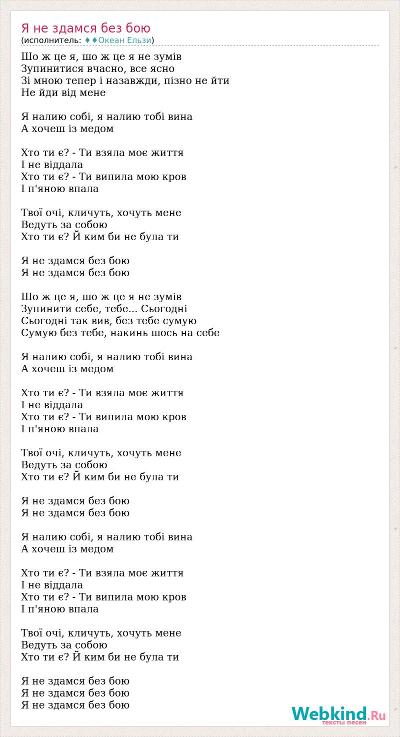 Шо ж це я, шо ж це я не зумів Зупинитися вчасно, все ясно Зі мною тепер і назавжди, пізно не йти Не йди від мене Я налию собі, я налию тобі вина А хочеш із медом Хто ти є? - Ти взяла моє життя І не віддала Хто ти є? - Ти випила мою кров І п'яною впала Твої очі, кличуть, хочуть мене Ведуть за собою Хто ти є? Й ким би не була ти Я не здамся без бою Я не здамся без бою Шо ж це я, шо ж це я не зумів Зупинити себе, тебе... Сьогодні Сьогодні так вив, без тебе сумую Сумую без тебе, накинь шось на себе Я налию собі, я налию тобі вина А хочеш із медом Хто ти є? - Ти взяла моє життя І не віддала Хто ти є? - Ти випила мою кров І п'яною впала Твої очі, кличуть, хочуть мене Ведуть за собою Хто ти є? Й ким би не була ти Я не здамся без бою Я не здамся без бою Я налию собі, я налию тобі вина А хочеш із медом Хто ти є? - Ти взяла моє життя І не віддала Хто ти є? - Ти випила мою кров І п'яною впала Твої очі, кличуть, хочуть мене Ведуть за собою Хто ти є? Й ким би не була ти Я не здамся без бою Я не здамся без бою Я не здамся без бою