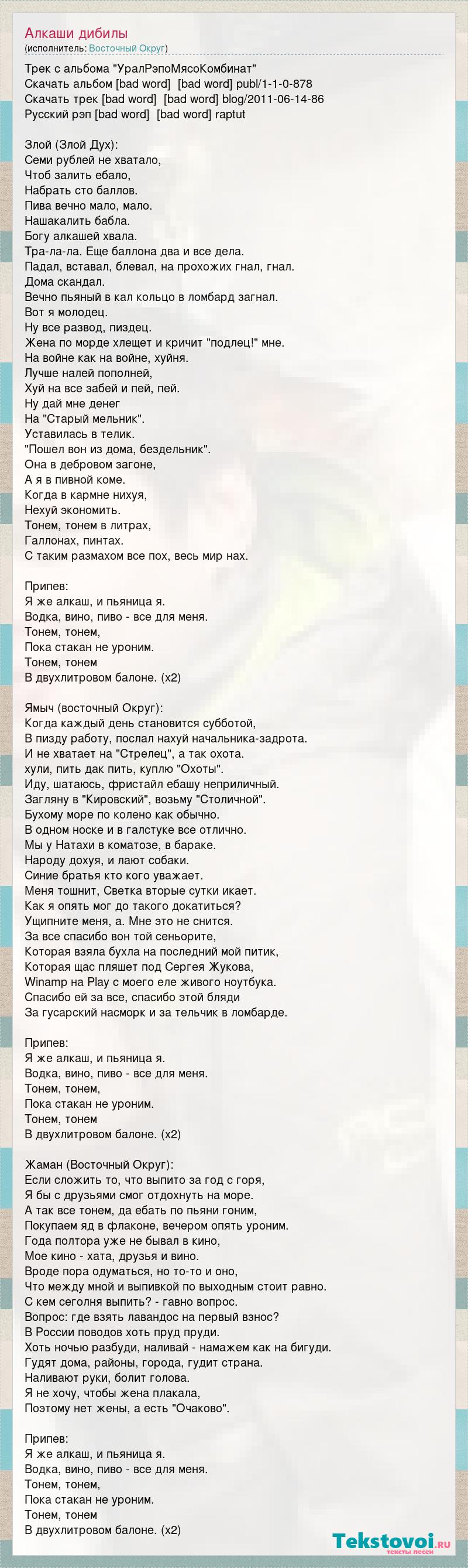 Трек с альбома "УралРэпоМясоКомбинат" Скачать альбом [bad word] [bad word] publ/1-1-0-878 Скачать трек [bad word] [bad word] blog/2011-06-14-86 Русский рэп [bad word] [bad word] raptut Злой (Злой Дух): Семи рублей не хватало, Чтоб залить ебало, Набрать сто баллов. Пива вечно мало, мало. Нашакалить бабла. Богу алкашей хвала. Тра-ла-ла. Еще баллона два и все дела. Падал, вставал, блевал, на прохожих гнал, гнал. Дома скандал. Вечно пьяный в кал кольцо в ломбард загнал. Вот я молодец. Ну все развод, пиздец. Жена по морде хлещет и кричит "подлец!" мне. На войне как на войне, хуйня. Лучше налей пополней, Хуй на все забей и пей, пей. Ну дай мне денег На "Старый мельник". Уставилась в телик. "Пошел вон из дома, бездельник". Она в дебровом загоне, А я в пивной коме. Когда в кармне нихуя, Нехуй экономить. Тонем, тонем в литрах, Галлонах, пинтах. С таким размахом все пох, весь мир нах. Припев: Я же алкаш, и пьяница я. Водка, вино, пиво - все для меня. Тонем, тонем, Пока стакан не уроним. Тонем, тонем В двухлитровом балоне. (x2) Ямыч (восточный Округ): Когда каждый день становится субботой, В пизду работу, послал нахуй начальника-задрота. И не хватает на "Стрелец", а так охота. хули, пить дак пить, куплю "Охоты". Иду, шатаюсь, фристайл ебашу неприличный. Загляну в "Кировский", возьму "Столичной". Бухому море по колено как обычно. В одном носке и в галстуке все отлично. Мы у Натахи в коматозе, в бараке. Народу дохуя, и лают собаки. Синие братья кто кого уважает. Меня тошнит, Светка вторые сутки икает. Как я опять мог до такого докатиться? Ущипните меня, а. Мне это не снится. За все спасибо вон той сеньорите, Которая взяла бухла на последний мой питик, Которая щас пляшет под Сергея Жукова, Winamp на Play с моего еле живого ноутбука. Спасибо ей за все, спасибо этой бляди За гусарский насморк и за тельчик в ломбарде. Припев: Я же алкаш, и пьяница я. Водка, вино, пиво - все для меня. Тонем, тонем, Пока стакан не уроним. Тонем, тонем В двухлитровом балоне. (x2) Жаман (Восточный Округ): Если сложить то, что выпито за год с горя, Я бы с друзьями смог отдохнуть на море. А так все тонем, да ебать по пьяни гоним, Покупаем яд в флаконе, вечером опять уроним. Года полтора уже не бывал в кино, Мое кино - хата, друзья и вино. Вроде пора одуматься, но то-то и оно, Что между мной и выпивкой по выходным стоит равно. С кем сеголня выпить? - гавно вопрос. Вопрос: где взять лавандос на первый взнос? В России поводов хоть пруд пруди. Хоть ночью разбуди, наливай - намажем как на бигуди. Гудят дома, районы, города, гудит страна. Наливают руки, болит голова. Я не хочу, чтобы жена плакала, Поэтому нет жены, а есть "Очаково". Припев: Я же алкаш, и пьяница я. Водка, вино, пиво - все для меня. Тонем, тонем, Пока стакан не уроним. Тонем, тонем В двухлитровом балоне. (x2)