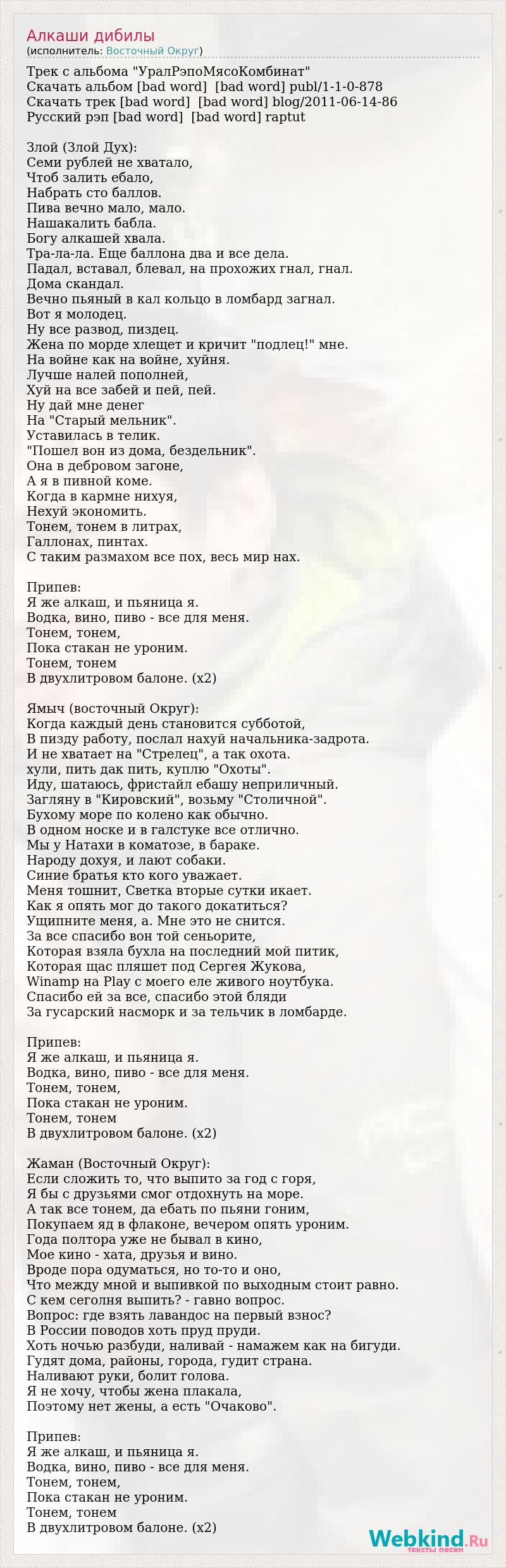 Трек с альбома "УралРэпоМясоКомбинат" Скачать альбом [bad word] [bad word] publ/1-1-0-878 Скачать трек [bad word] [bad word] blog/2011-06-14-86 Русский рэп [bad word] [bad word] raptut Злой (Злой Дух): Семи рублей не хватало, Чтоб залить ебало, Набрать сто баллов. Пива вечно мало, мало. Нашакалить бабла. Богу алкашей хвала. Тра-ла-ла. Еще баллона два и все дела. Падал, вставал, блевал, на прохожих гнал, гнал. Дома скандал. Вечно пьяный в кал кольцо в ломбард загнал. Вот я молодец. Ну все развод, пиздец. Жена по морде хлещет и кричит "подлец!" мне. На войне как на войне, хуйня. Лучше налей пополней, Хуй на все забей и пей, пей. Ну дай мне денег На "Старый мельник". Уставилась в телик. "Пошел вон из дома, бездельник". Она в дебровом загоне, А я в пивной коме. Когда в кармне нихуя, Нехуй экономить. Тонем, тонем в литрах, Галлонах, пинтах. С таким размахом все пох, весь мир нах. Припев: Я же алкаш, и пьяница я. Водка, вино, пиво - все для меня. Тонем, тонем, Пока стакан не уроним. Тонем, тонем В двухлитровом балоне. (x2) Ямыч (восточный Округ): Когда каждый день становится субботой, В пизду работу, послал нахуй начальника-задрота. И не хватает на "Стрелец", а так охота. хули, пить дак пить, куплю "Охоты". Иду, шатаюсь, фристайл ебашу неприличный. Загляну в "Кировский", возьму "Столичной". Бухому море по колено как обычно. В одном носке и в галстуке все отлично. Мы у Натахи в коматозе, в бараке. Народу дохуя, и лают собаки. Синие братья кто кого уважает. Меня тошнит, Светка вторые сутки икает. Как я опять мог до такого докатиться? Ущипните меня, а. Мне это не снится. За все спасибо вон той сеньорите, Которая взяла бухла на последний мой питик, Которая щас пляшет под Сергея Жукова, Winamp на Play с моего еле живого ноутбука. Спасибо ей за все, спасибо этой бляди За гусарский насморк и за тельчик в ломбарде. Припев: Я же алкаш, и пьяница я. Водка, вино, пиво - все для меня. Тонем, тонем, Пока стакан не уроним. Тонем, тонем В двухлитровом балоне. (x2) Жаман (Восточный Округ): Если сложить то, что выпито за год с горя, Я бы с друзьями смог отдохнуть на море. А так все тонем, да ебать по пьяни гоним, Покупаем яд в флаконе, вечером опять уроним. Года полтора уже не бывал в кино, Мое кино - хата, друзья и вино. Вроде пора одуматься, но то-то и оно, Что между мной и выпивкой по выходным стоит равно. С кем сеголня выпить? - гавно вопрос. Вопрос: где взять лавандос на первый взнос? В России поводов хоть пруд пруди. Хоть ночью разбуди, наливай - намажем как на бигуди. Гудят дома, районы, города, гудит страна. Наливают руки, болит голова. Я не хочу, чтобы жена плакала, Поэтому нет жены, а есть "Очаково". Припев: Я же алкаш, и пьяница я. Водка, вино, пиво - все для меня. Тонем, тонем, Пока стакан не уроним. Тонем, тонем В двухлитровом балоне. (x2)