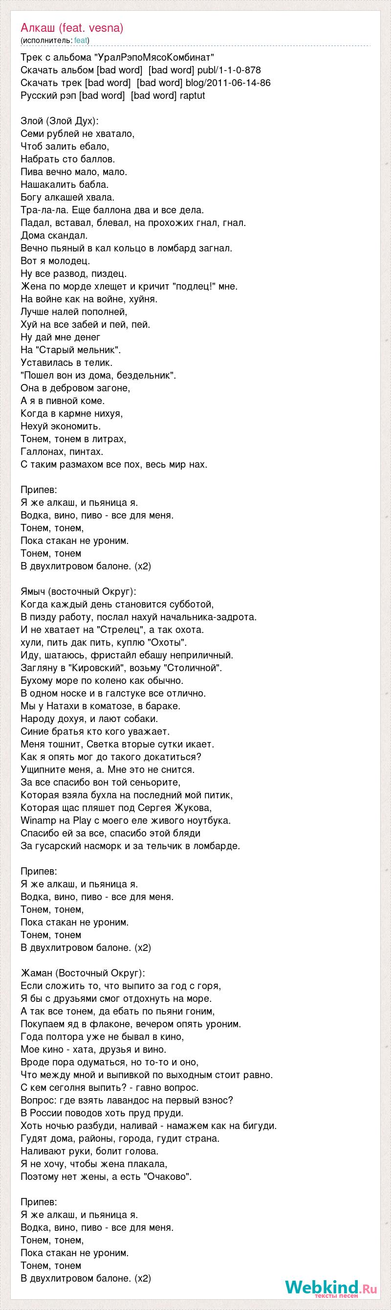Трек с альбома "УралРэпоМясоКомбинат" Скачать альбом [bad word] [bad word] publ/1-1-0-878 Скачать трек [bad word] [bad word] blog/2011-06-14-86 Русский рэп [bad word] [bad word] raptut Злой (Злой Дух): Семи рублей не хватало, Чтоб залить ебало, Набрать сто баллов. Пива вечно мало, мало. Нашакалить бабла. Богу алкашей хвала. Тра-ла-ла. Еще баллона два и все дела. Падал, вставал, блевал, на прохожих гнал, гнал. Дома скандал. Вечно пьяный в кал кольцо в ломбард загнал. Вот я молодец. Ну все развод, пиздец. Жена по морде хлещет и кричит "подлец!" мне. На войне как на войне, хуйня. Лучше налей пополней, Хуй на все забей и пей, пей. Ну дай мне денег На "Старый мельник". Уставилась в телик. "Пошел вон из дома, бездельник". Она в дебровом загоне, А я в пивной коме. Когда в кармне нихуя, Нехуй экономить. Тонем, тонем в литрах, Галлонах, пинтах. С таким размахом все пох, весь мир нах. Припев: Я же алкаш, и пьяница я. Водка, вино, пиво - все для меня. Тонем, тонем, Пока стакан не уроним. Тонем, тонем В двухлитровом балоне. (x2) Ямыч (восточный Округ): Когда каждый день становится субботой, В пизду работу, послал нахуй начальника-задрота. И не хватает на "Стрелец", а так охота. хули, пить дак пить, куплю "Охоты". Иду, шатаюсь, фристайл ебашу неприличный. Загляну в "Кировский", возьму "Столичной". Бухому море по колено как обычно. В одном носке и в галстуке все отлично. Мы у Натахи в коматозе, в бараке. Народу дохуя, и лают собаки. Синие братья кто кого уважает. Меня тошнит, Светка вторые сутки икает. Как я опять мог до такого докатиться? Ущипните меня, а. Мне это не снится. За все спасибо вон той сеньорите, Которая взяла бухла на последний мой питик, Которая щас пляшет под Сергея Жукова, Winamp на Play с моего еле живого ноутбука. Спасибо ей за все, спасибо этой бляди За гусарский насморк и за тельчик в ломбарде. Припев: Я же алкаш, и пьяница я. Водка, вино, пиво - все для меня. Тонем, тонем, Пока стакан не уроним. Тонем, тонем В двухлитровом балоне. (x2) Жаман (Восточный Округ): Если сложить то, что выпито за год с горя, Я бы с друзьями смог отдохнуть на море. А так все тонем, да ебать по пьяни гоним, Покупаем яд в флаконе, вечером опять уроним. Года полтора уже не бывал в кино, Мое кино - хата, друзья и вино. Вроде пора одуматься, но то-то и оно, Что между мной и выпивкой по выходным стоит равно. С кем сеголня выпить? - гавно вопрос. Вопрос: где взять лавандос на первый взнос? В России поводов хоть пруд пруди. Хоть ночью разбуди, наливай - намажем как на бигуди. Гудят дома, районы, города, гудит страна. Наливают руки, болит голова. Я не хочу, чтобы жена плакала, Поэтому нет жены, а есть "Очаково". Припев: Я же алкаш, и пьяница я. Водка, вино, пиво - все для меня. Тонем, тонем, Пока стакан не уроним. Тонем, тонем В двухлитровом балоне. (x2)
